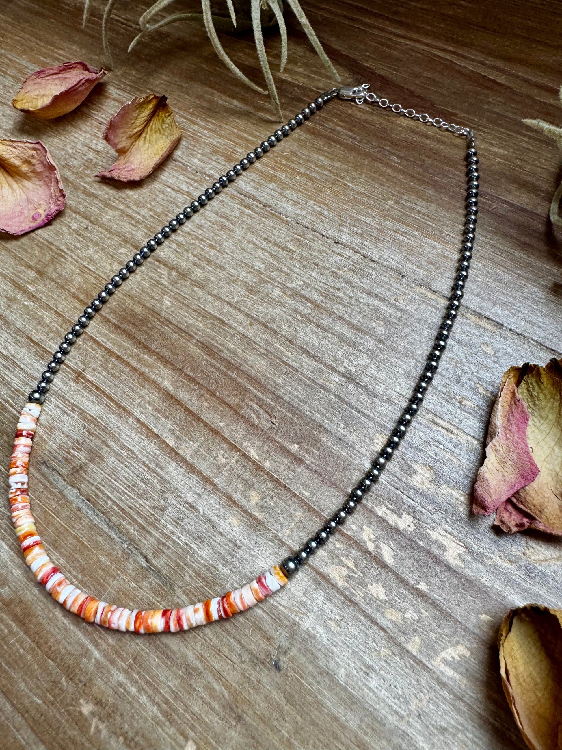 This 15-inch necklace (plus extender) features spiny oyster heishi beads in vibrant orange tones, paired with 3mm and 4mm sterling silver pearls for a statement that’s bold, warm, and full of character.