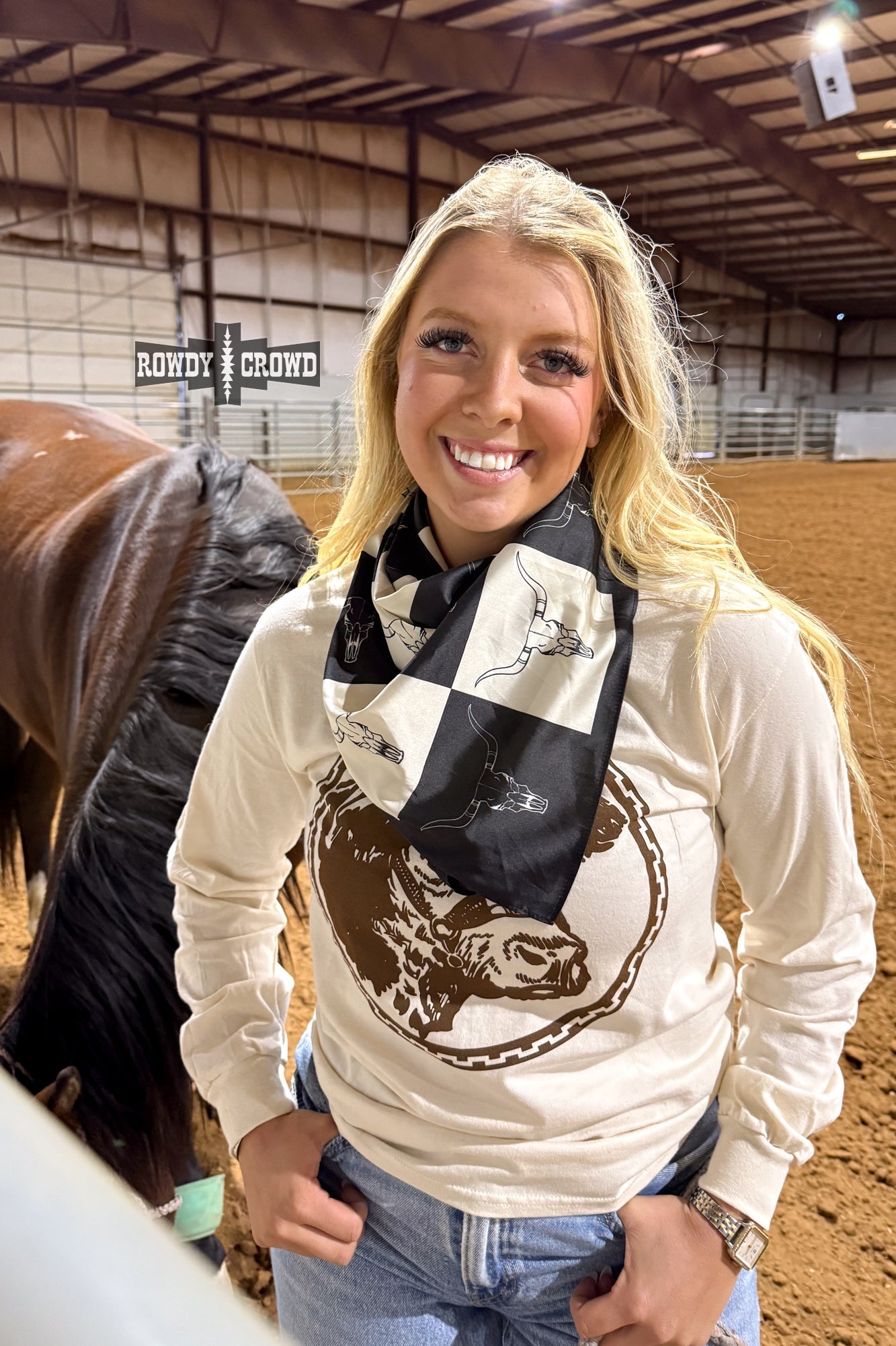 Sweatshirt elevation achieved with this stylish pullover. Perfect for layering and perfect length to wear over leggings or with jeans. Love the cowboy on horseback motif making this top not just another sweatshirt. Look forward to wearing this well made top to work or for leisure outings.