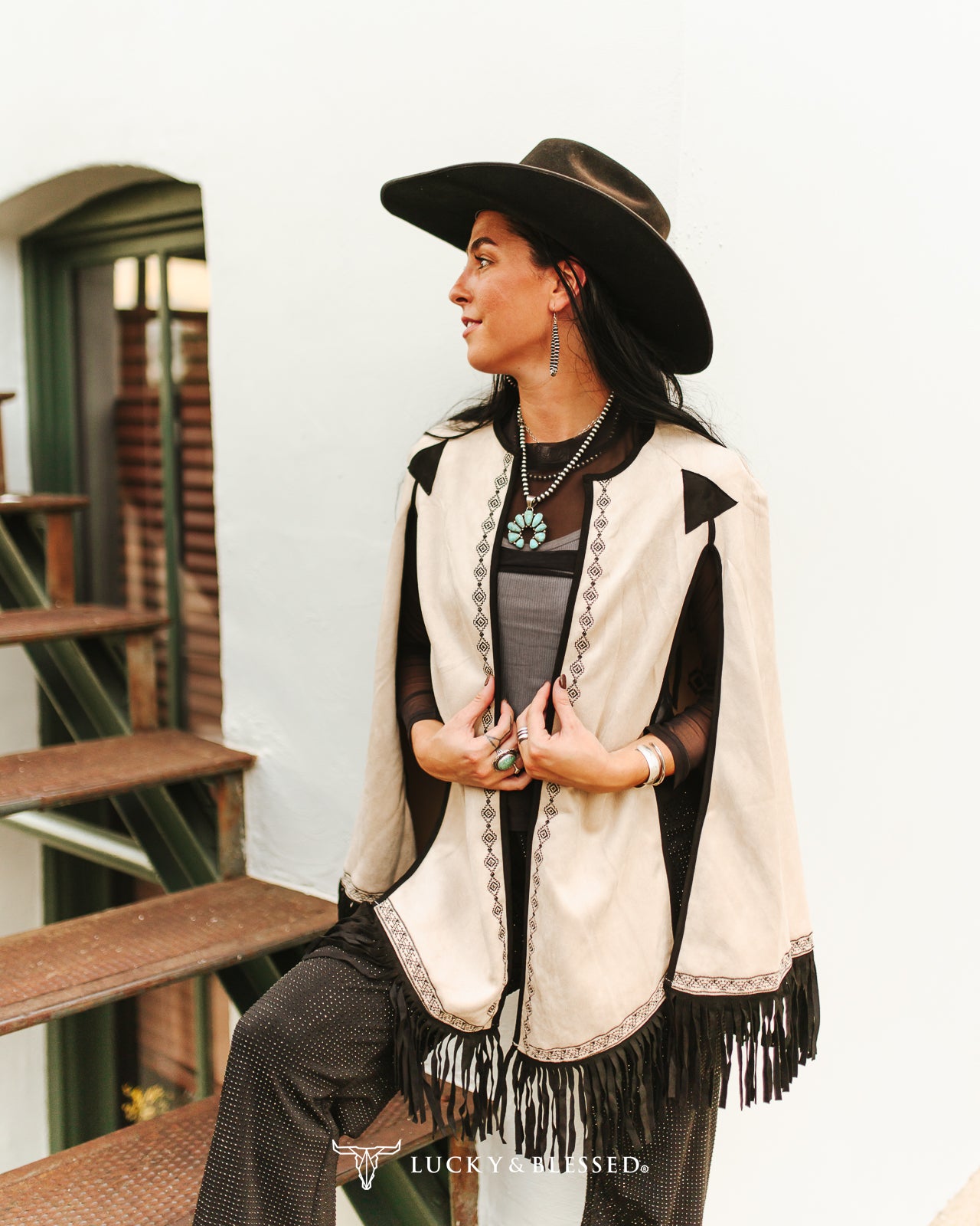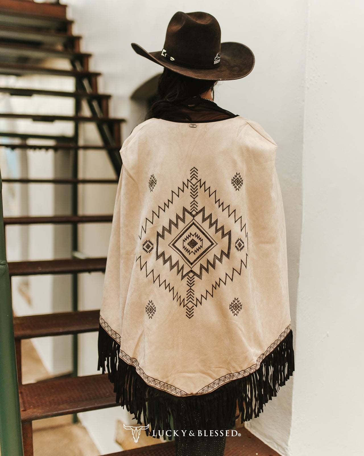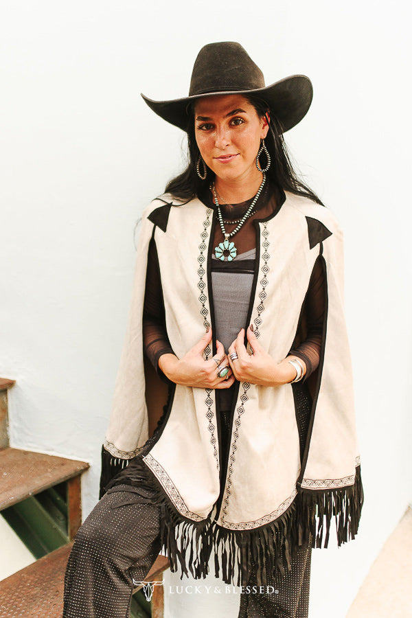 Command attention in this bold and timeless Ivory Suede Fringe Cape with Aztec Embroidery – a Western essential for the fashion-forward cowgirl. This statement cape features a luxe faux suede finish, detailed contrast Aztec embroidery trim in gold and rust, and dramatic fringe edging for a signature Western flair. The back showcases a bold geometric Aztec motif in rich desert tones, creating an eye-catching silhouette that turns heads in every direction. Perfect for layering over denim and boots, this versatile cape brings elevated Southwestern charm to any boutique collection. Ideal for rodeos, markets, or everyday styling.