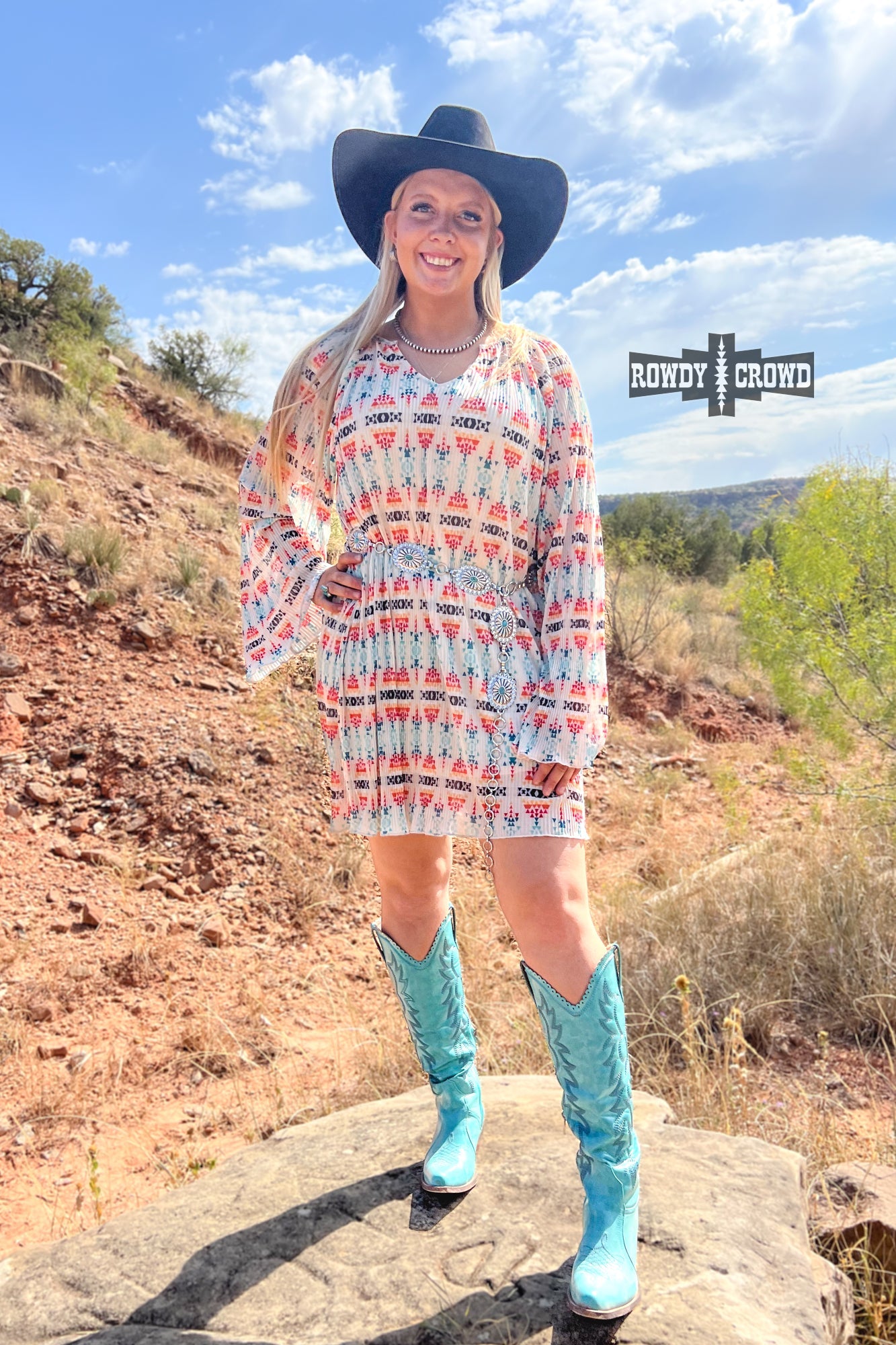 Are you ready to have some fun in our Darlene Dress! This stylish dress features a flawless Aztec print that will make you stand out from the crowd. With long sleeves and a convenient belt, it's not only fashionable but also comfortable. A must-have for any fashion-forward individual!