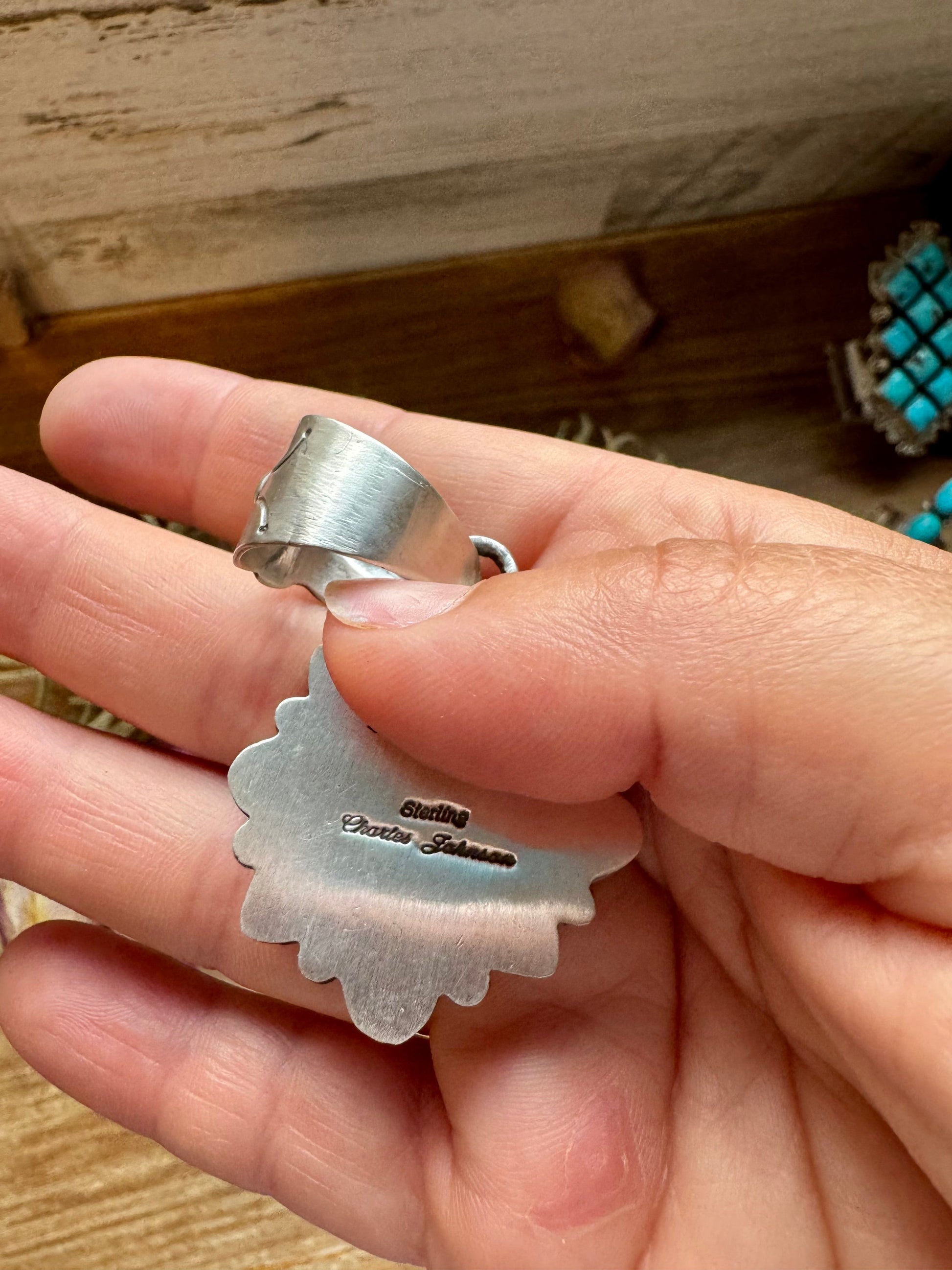 Handmade in the USA by Navajo silversmith Charles Johnson, this sterling silver pendant features a flower-shaped design with a vibrant Sonoran Gold turquoise centerpiece. Stamped for authenticity, it showcases detailed silverwork and the rich green-blue hues that Sonoran Gold turquoise is known for. The large bail fits up to 10mm pearls, making it perfect to wear with a sterling silver pearl strand or layer with other Southwestern pieces.