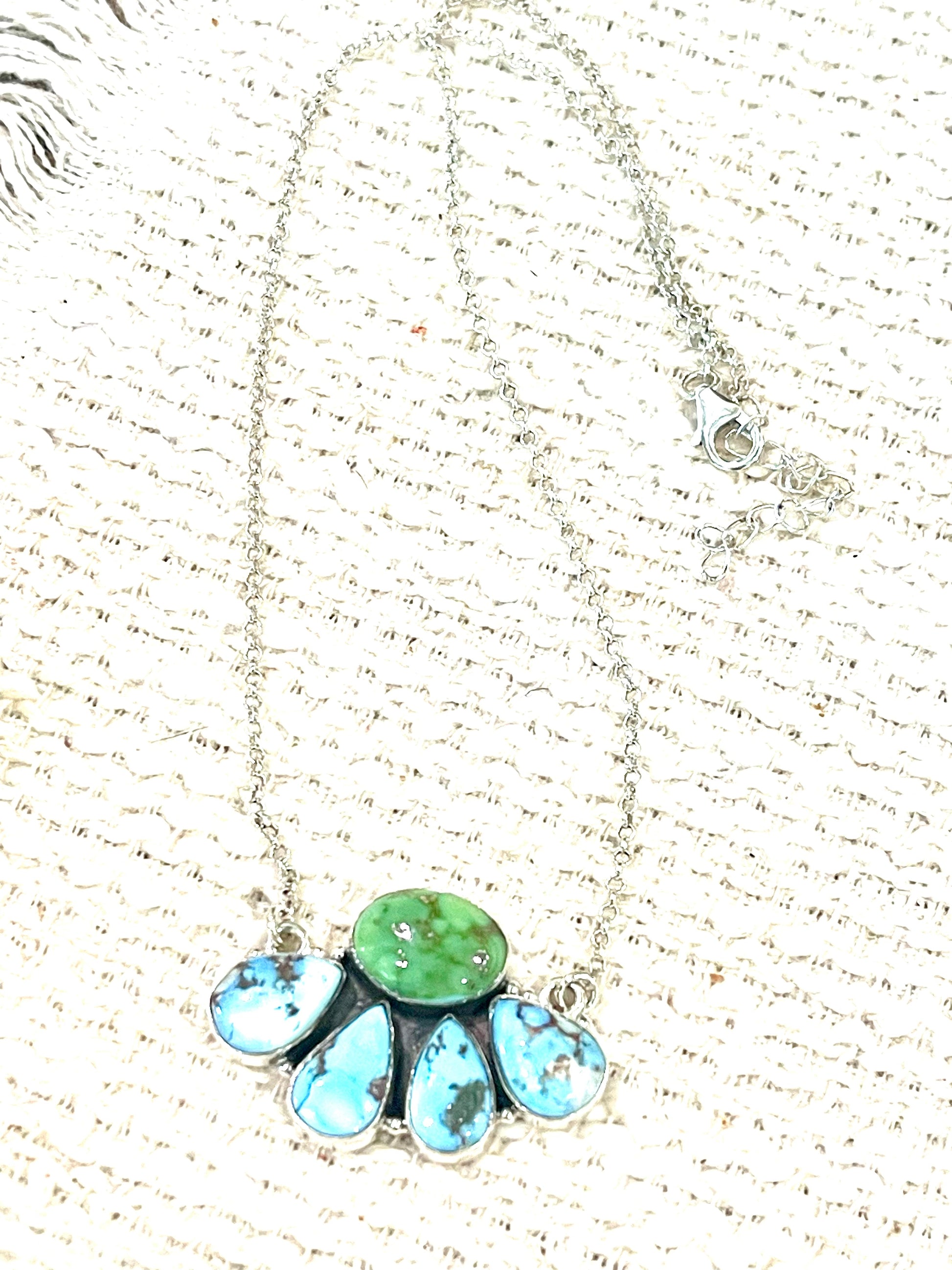 Such gorgeous craftsmanship! Sterling Silver Golden Hills Turquoise, Sonoran Mountain Turquoise Necklace. Necklace measures 16-18 inches long.
