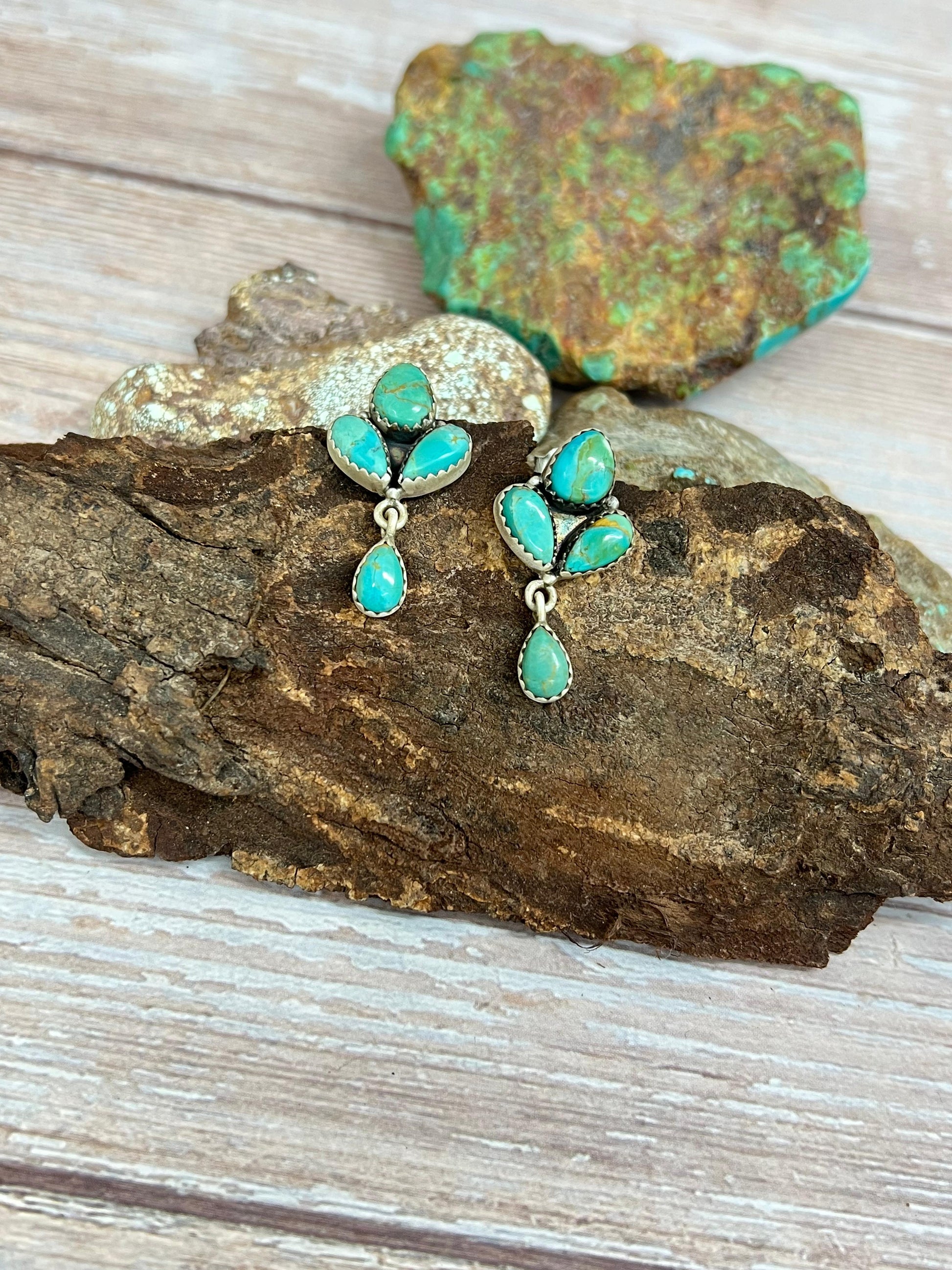 Handmade Sterling Silver Kingman Turquoise Post Dangle Earrings with Signed Nizhoni