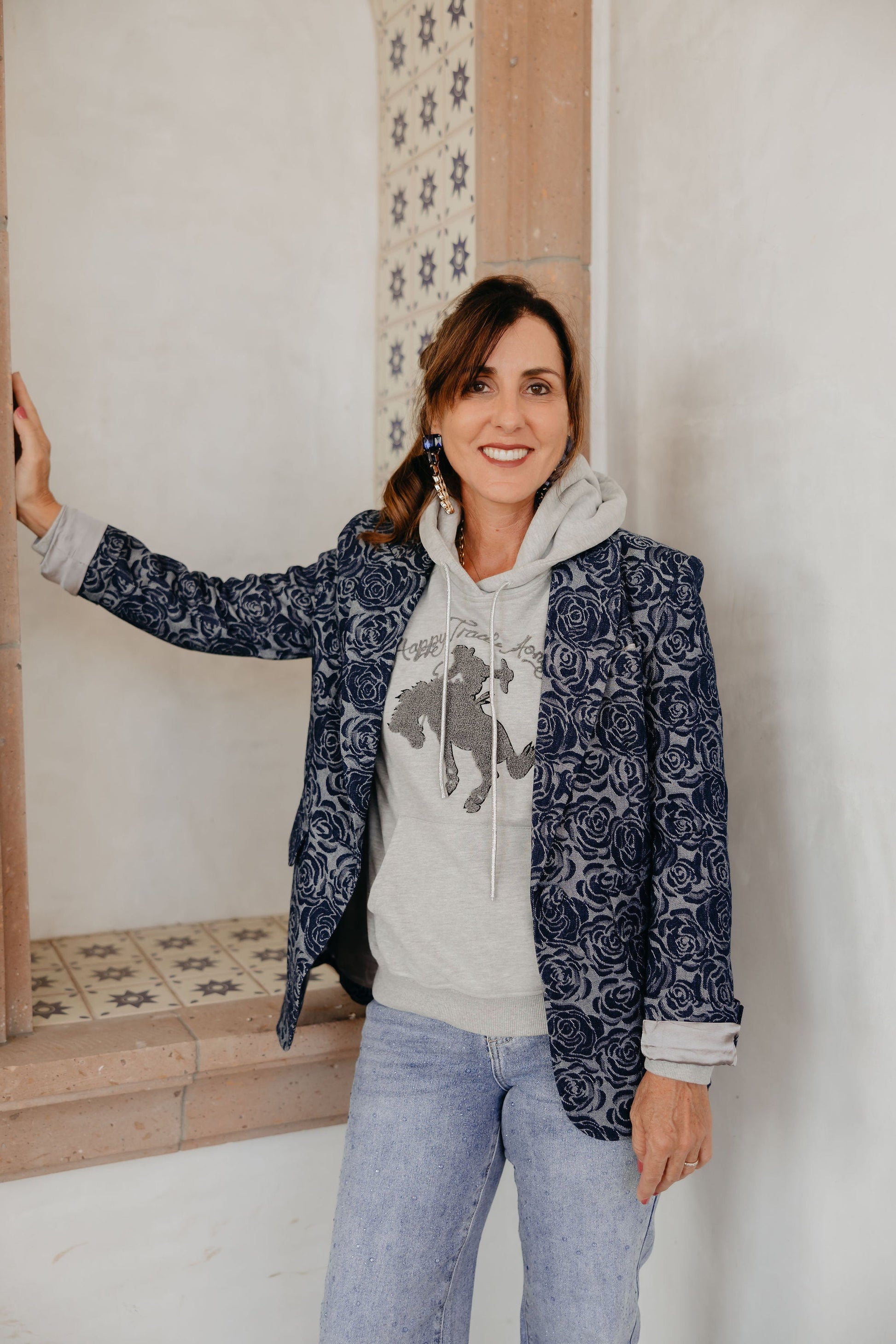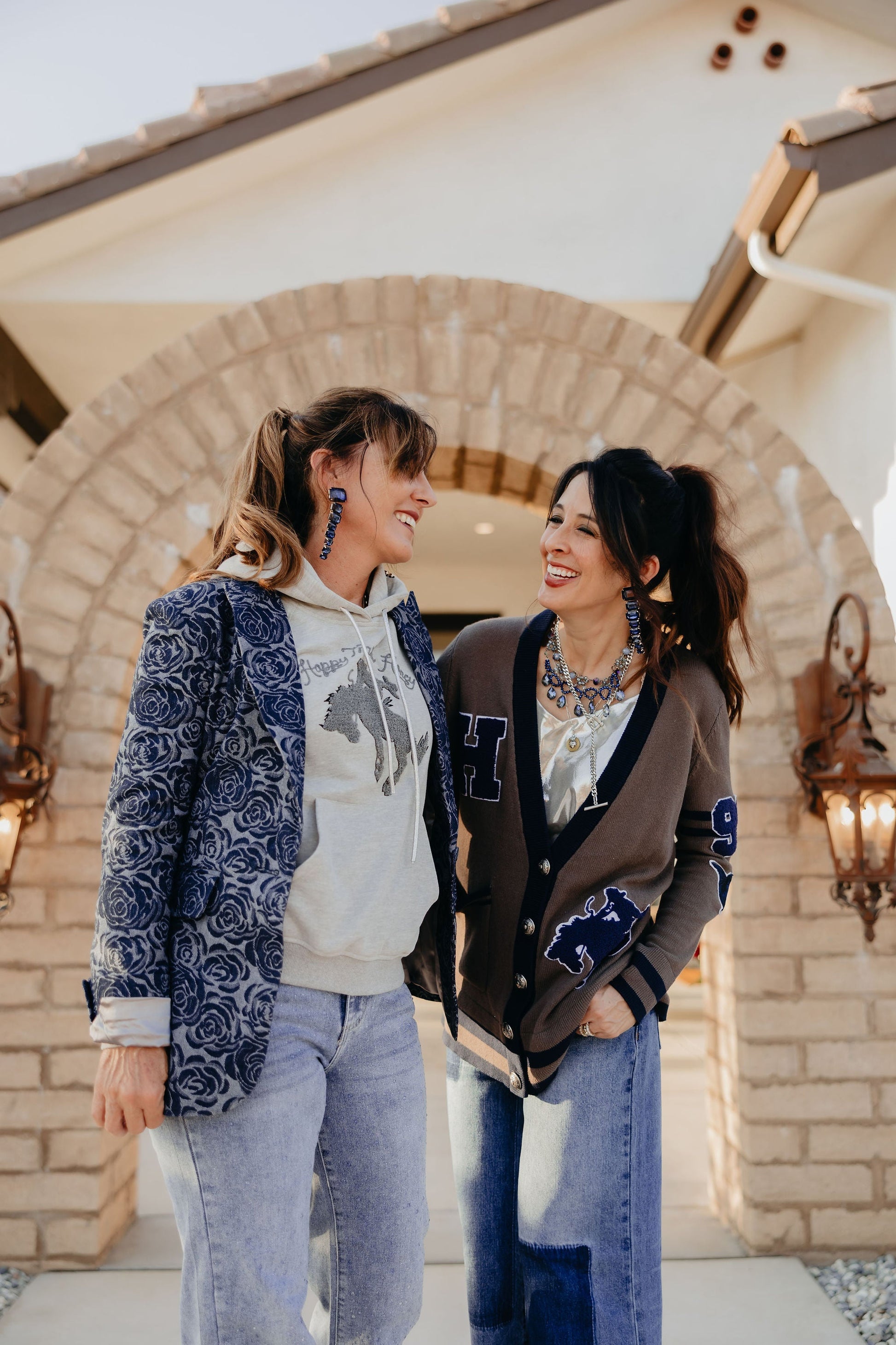 Snuggle up in this chic hoodie, inspired by Lily’s favorite look. Featuring shimmering metallic drawstrings and a beautiful “Happy Trails Honey” patch, this soft gray staple pays homage to Lily’s daughter and the timeless Western tune. It’s the perfect blend of cozy comfort and timeless style, sending you off with good vibes and a touch of shine.