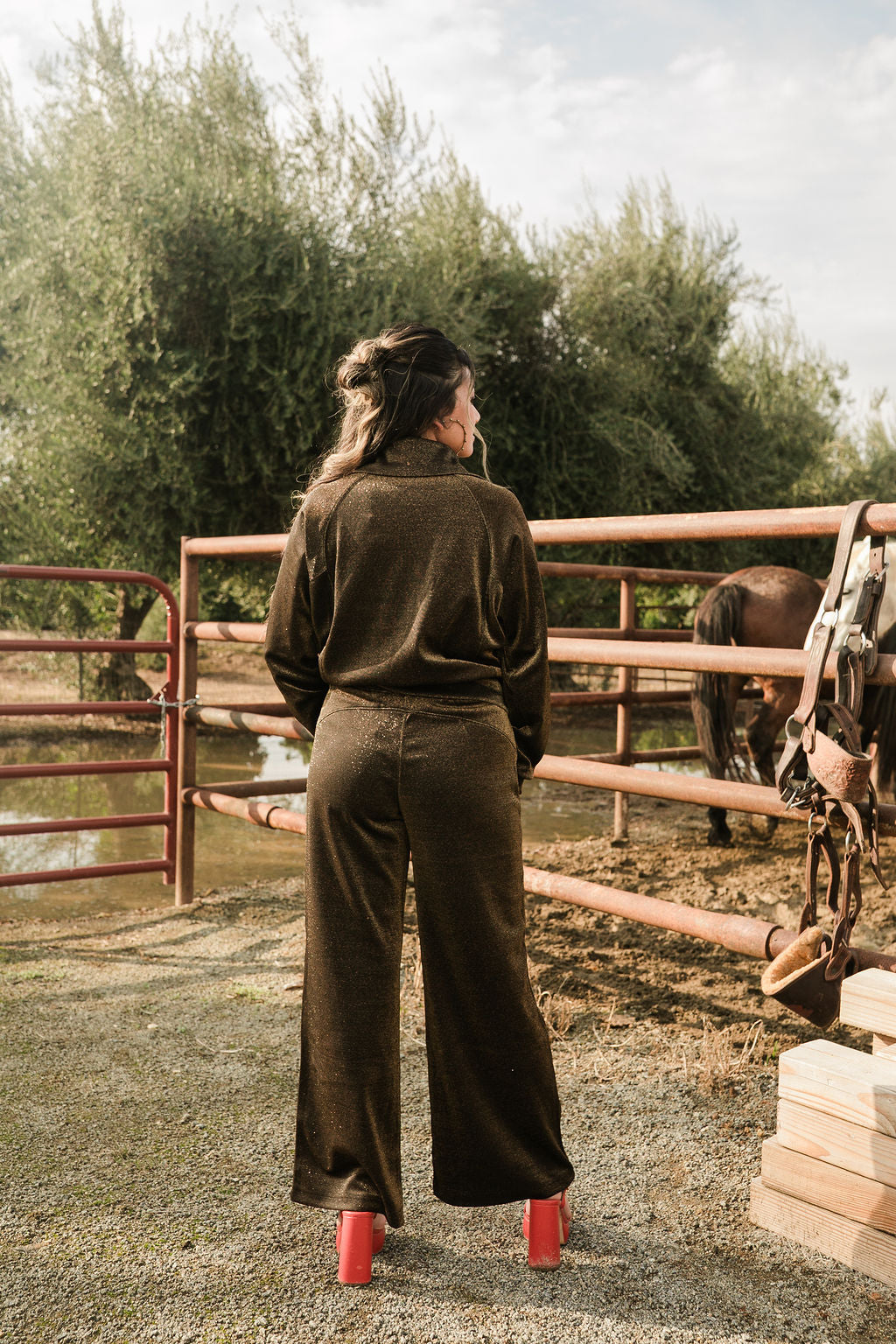Turn every head in the Heaven Sent Bottoms — dazzling, gold-glitter yoga pants that shimmer like stardust against a sleek black base. With a flowy wide-leg fit and bold black smiley pockets, they’re made for the cowgirl who walks in confidence and leaves a little sparkle wherever she goes.