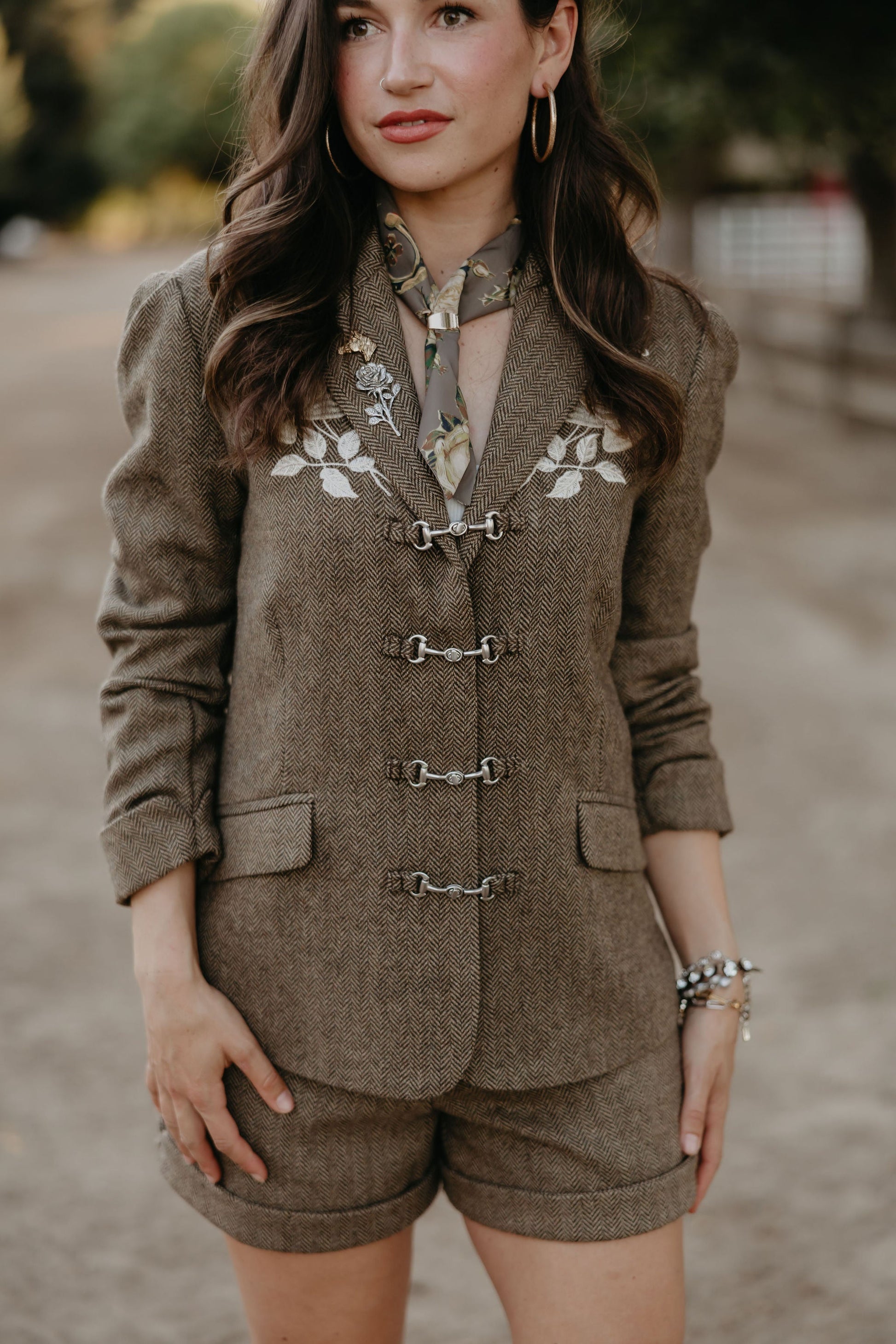 The Holman Herringbone Shorts bring a playful twist to classic Western tailoring, crafted from the same rich tweed as the matching jacket. Featuring signature smile pockets, they channel vintage rodeo charm with a polished, modern fit.