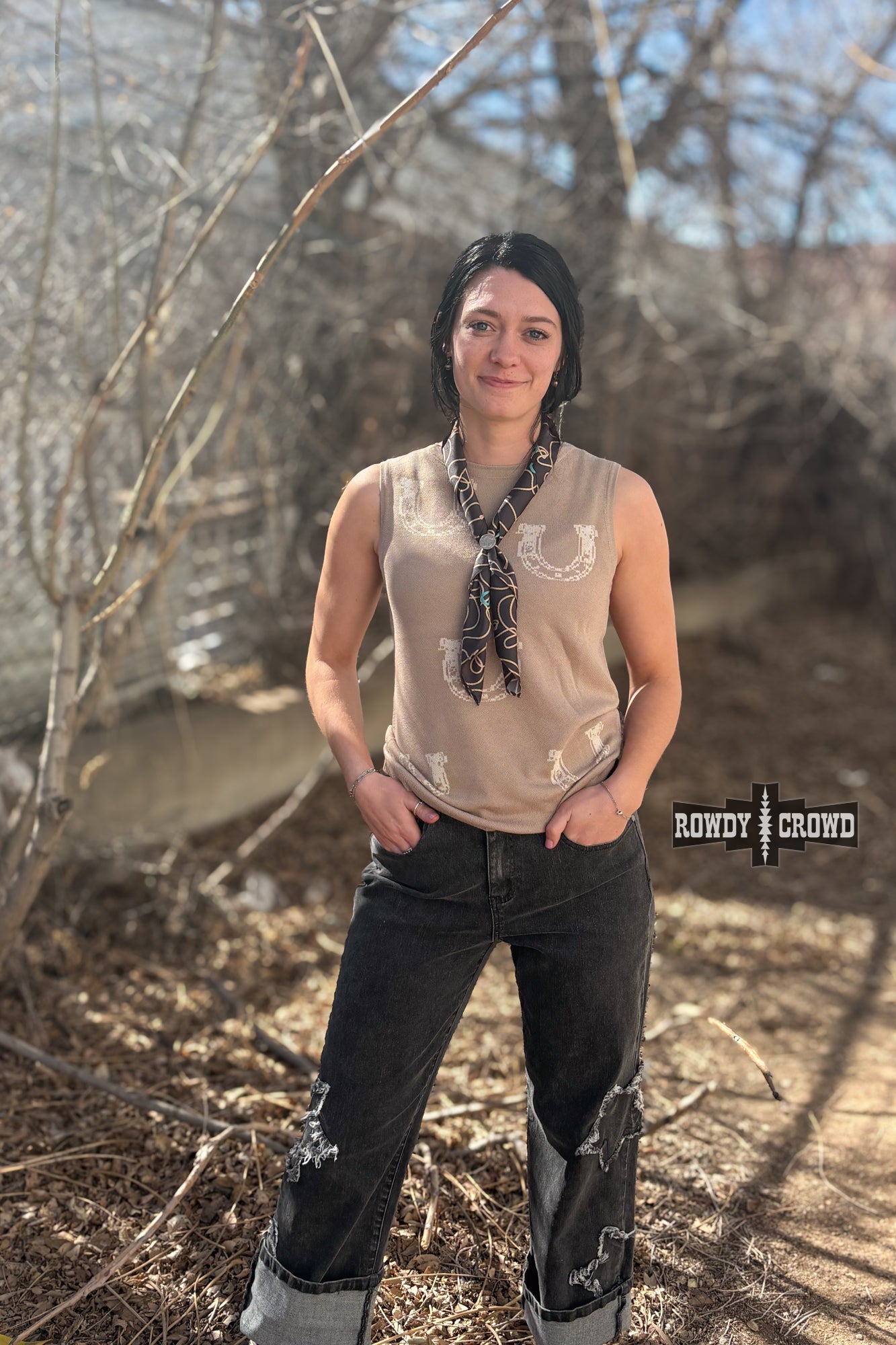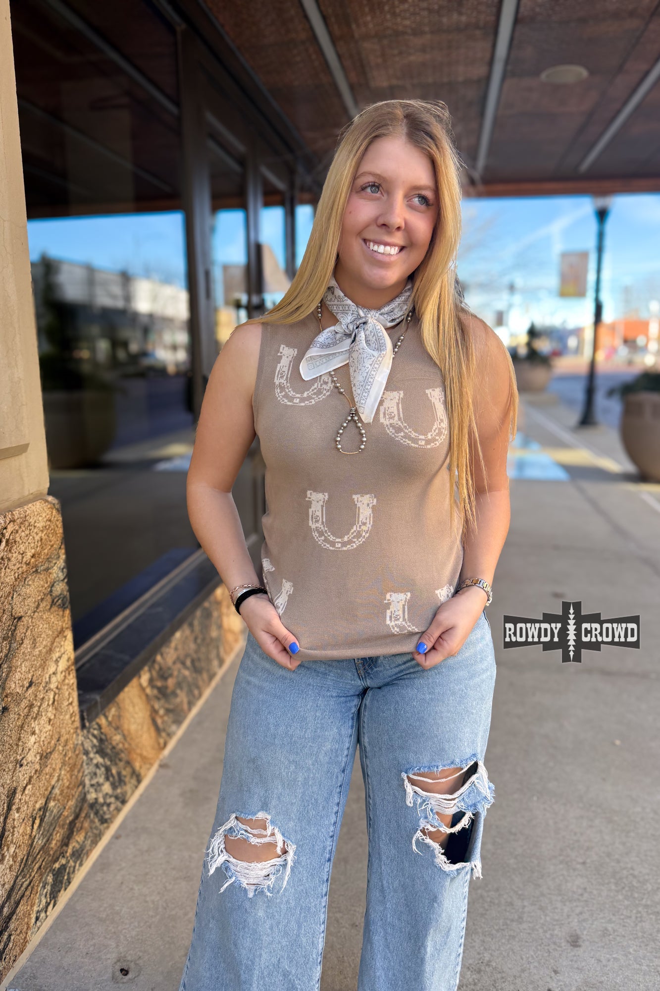 The Horseshoe Honey Tank is that effortlessly western layer every closet needs. Soft, lightweight, and easy to style, it features an allover horseshoe pattern woven right into the knit—subtle, punchy, and full of good-luck charm. The neutral taupe tone keeps it versatile, while the relaxed fit makes it perfect for rodeo nights, market days, or tossing on under your favorite jacket.