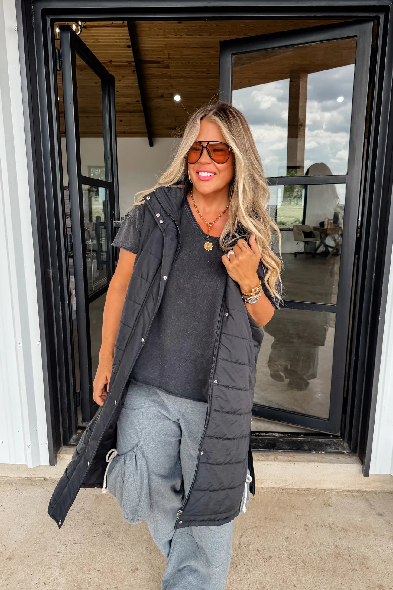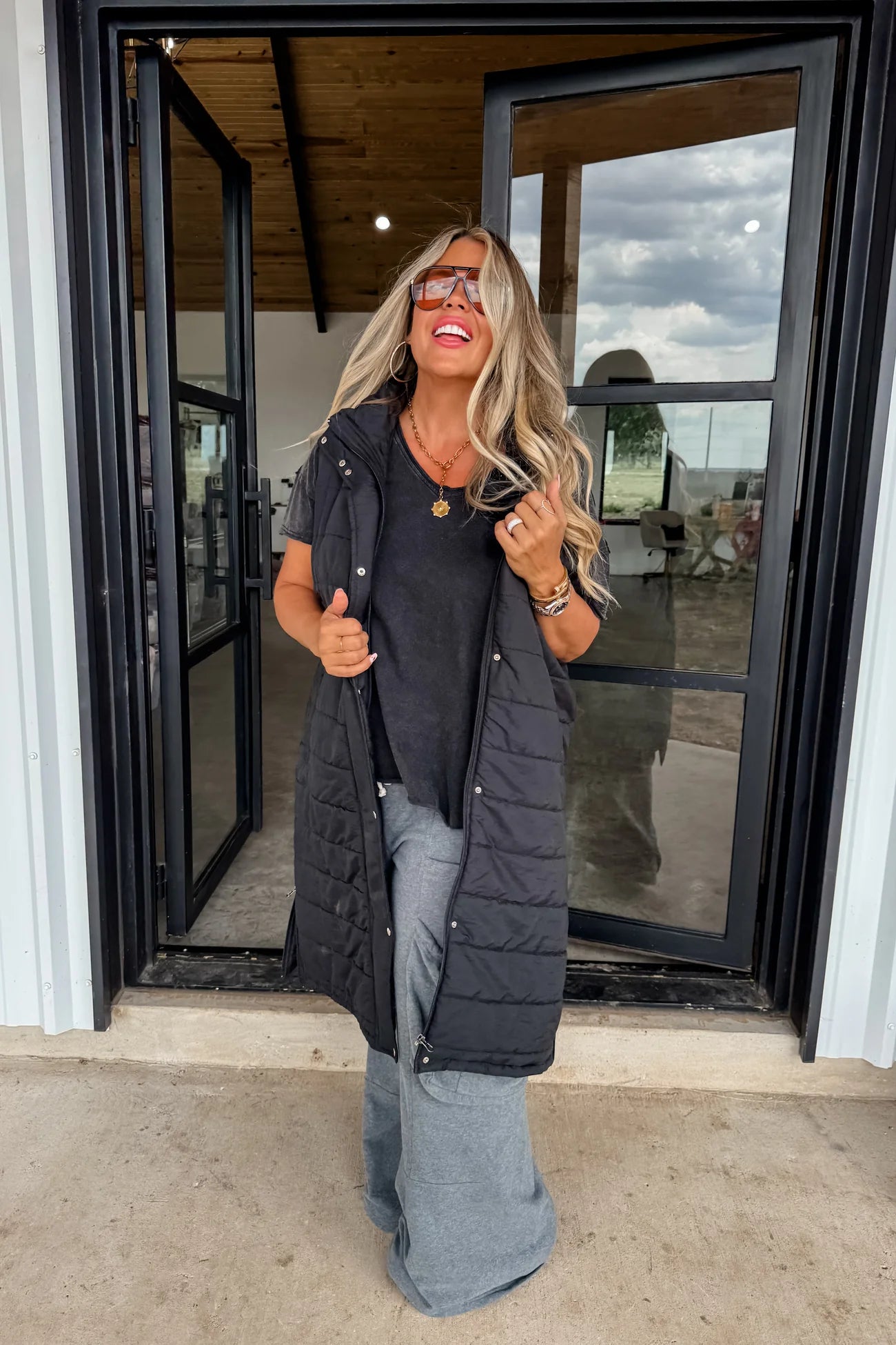 Stay warm and stylish this winter with the CUTEST LONG PUFFER VEST. Features snap buttons, ZIPPER and side pockets. Even the sides have a working zipper detail!