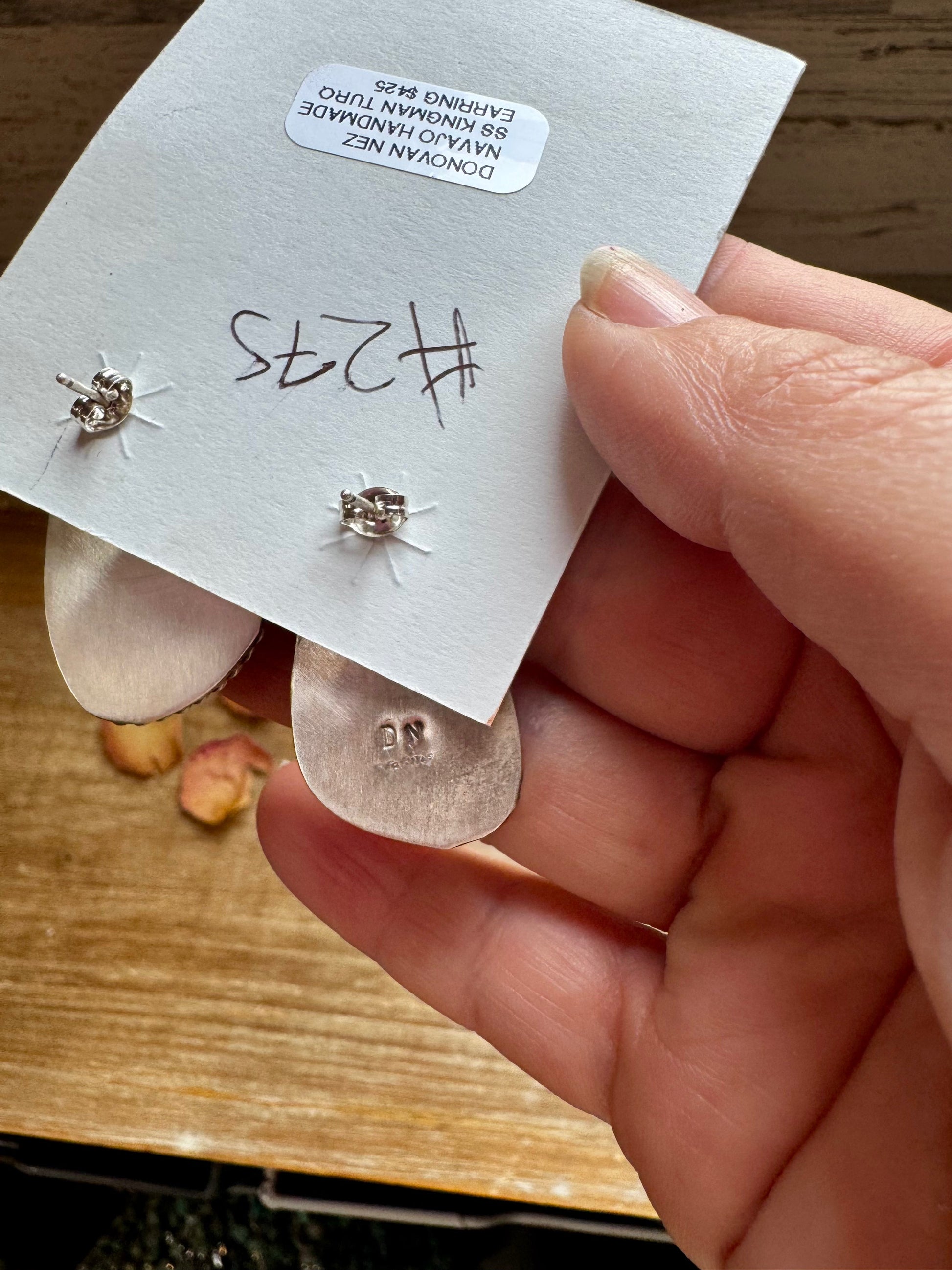 These bold 1.5-inch Kingman turquoise stud earrings are handcrafted in sterling silver by Navajo artist Donovan Nez. Featuring rich sky-blue turquoise with natural matrix, they offer a classic southwestern look with standout style.