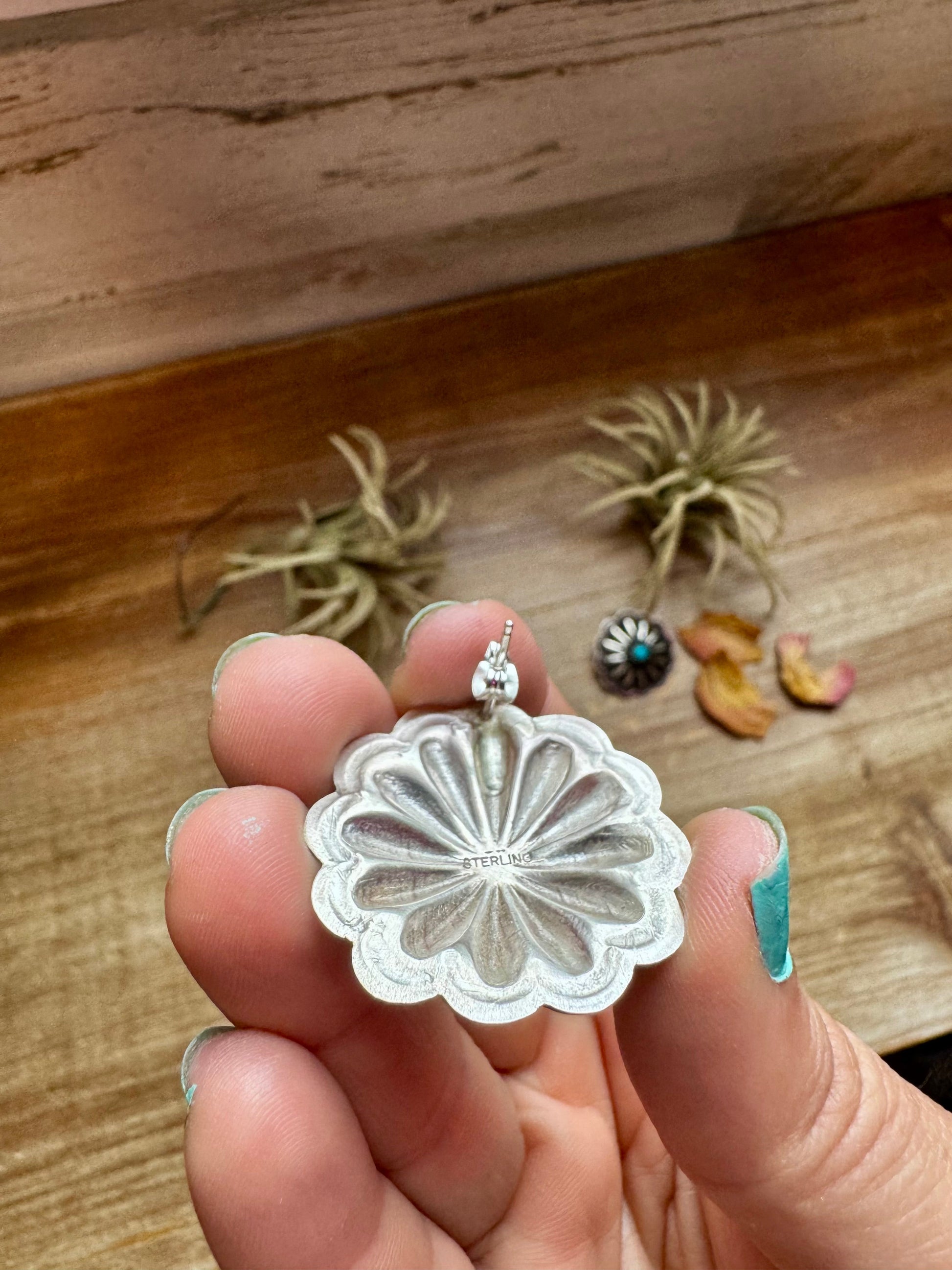 These large concho stud earrings feature genuine turquoise stones set in beautifully detailed sterling silver. Despite their bold size, they’re lightweight and comfortable, making them perfect for all-day wear with western flair.