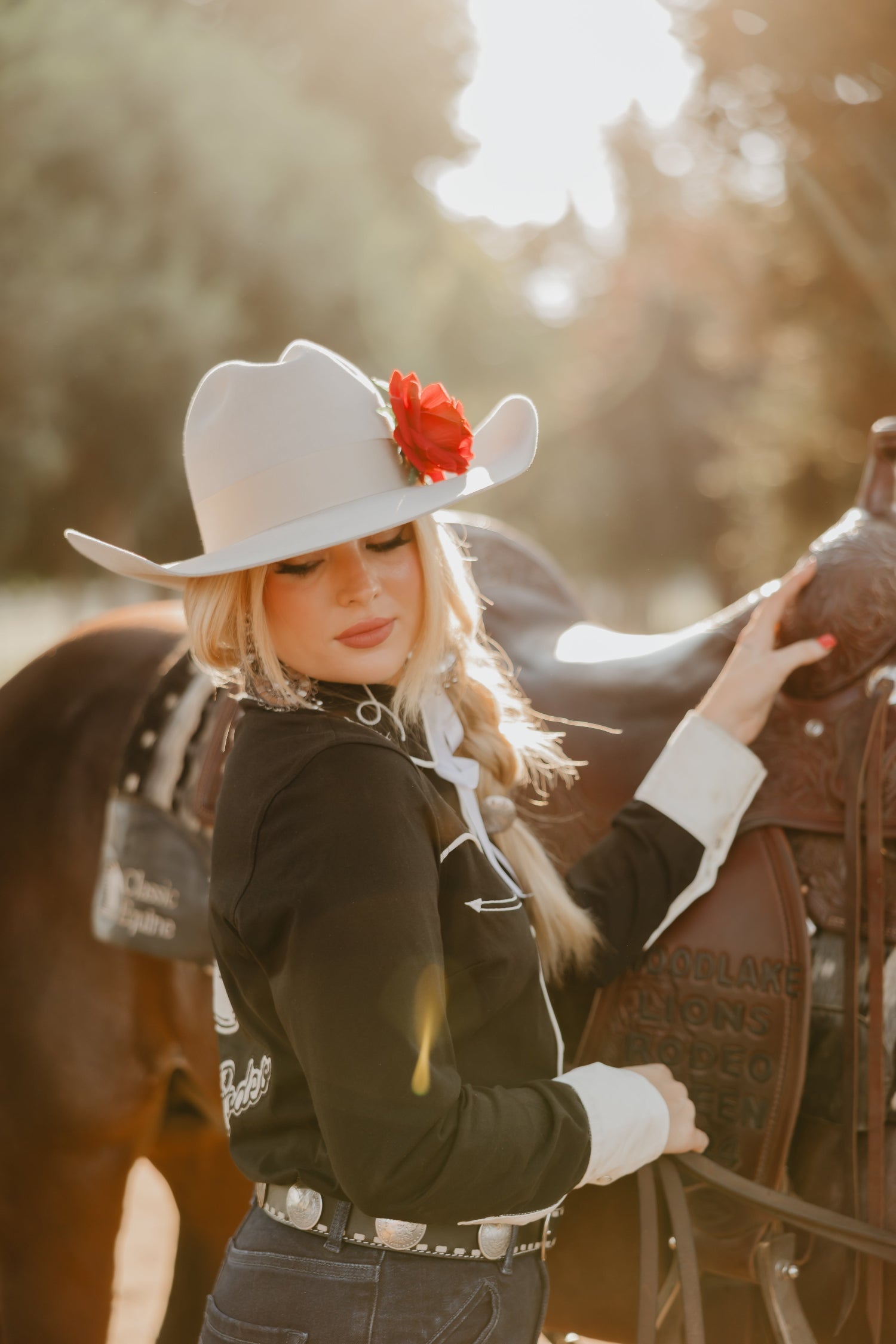 The Let’s Rodeo Button Up is a sharp, statement-making classic with a Rodeo Quincy twist. With pearl snaps, intricate embroidery on the collar and shoulders, and a bold horseshoe and “Let’s Rodeo” stitched on the back, this black beauty is ready for the spotlight. It's made for late nights, bright lights, and cowgirls who always make an entrance.