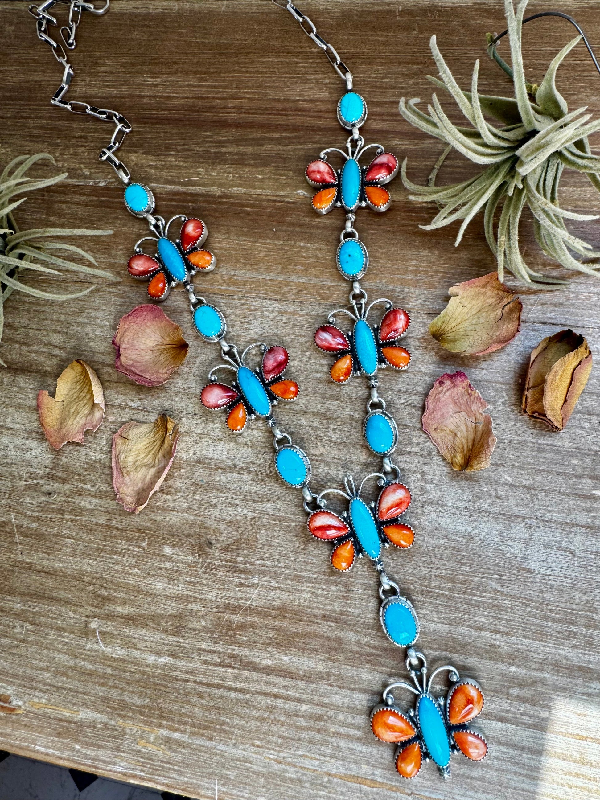 A breathtaking statement piece featuring six beautifully detailed sterling silver butterflies, each set with Kingman turquoise and spiny oyster. This USA-made necklace is strung on a 32.5-inch paper clip sterling silver chain with a dramatic 4-inch drop. The contrast of vibrant turquoise and deep spiny oyster adds a warm, earthy elegance. Truly one-of-a-kind, it’s a wearable piece of art that brings bold character to any outfit.