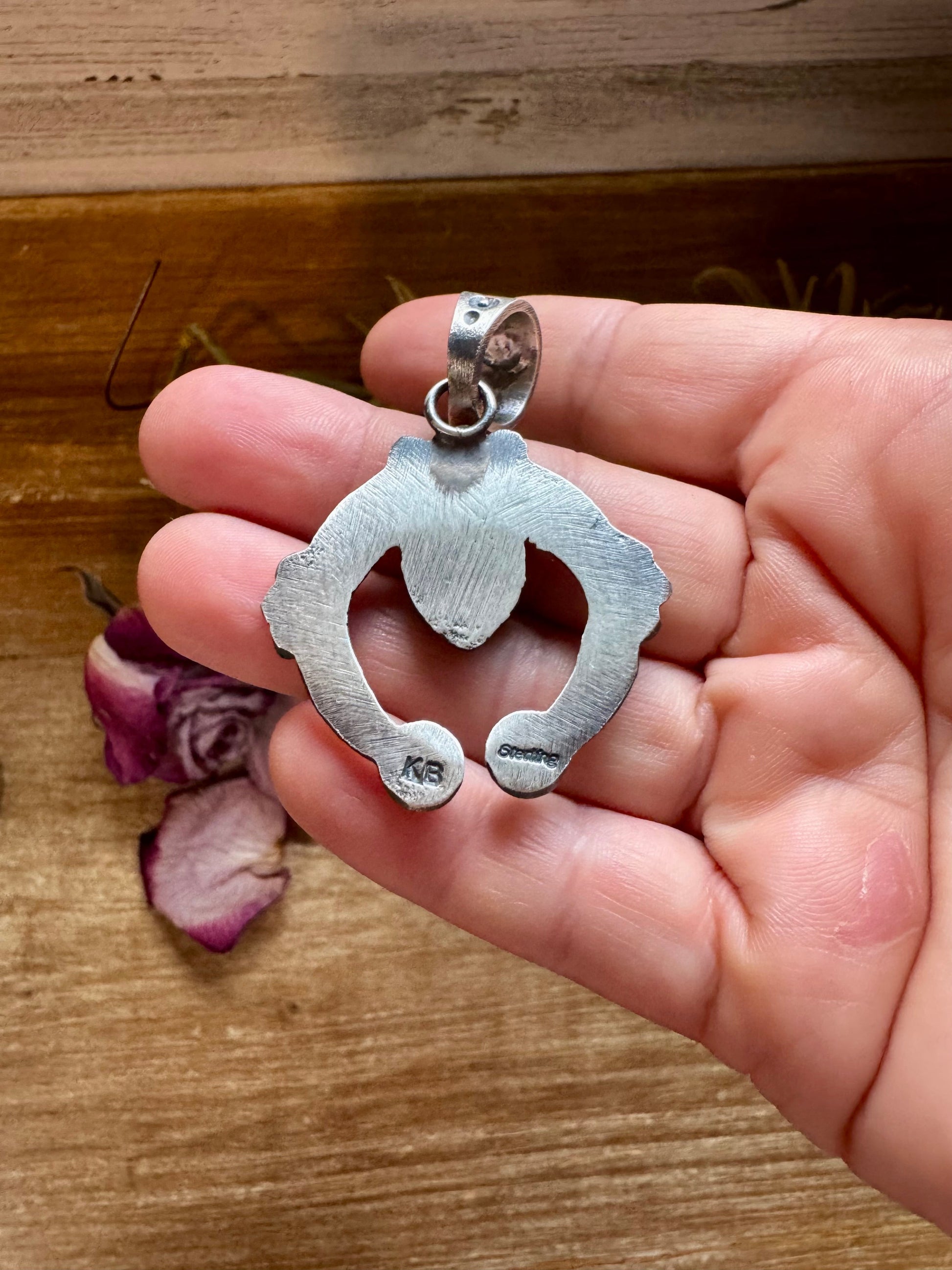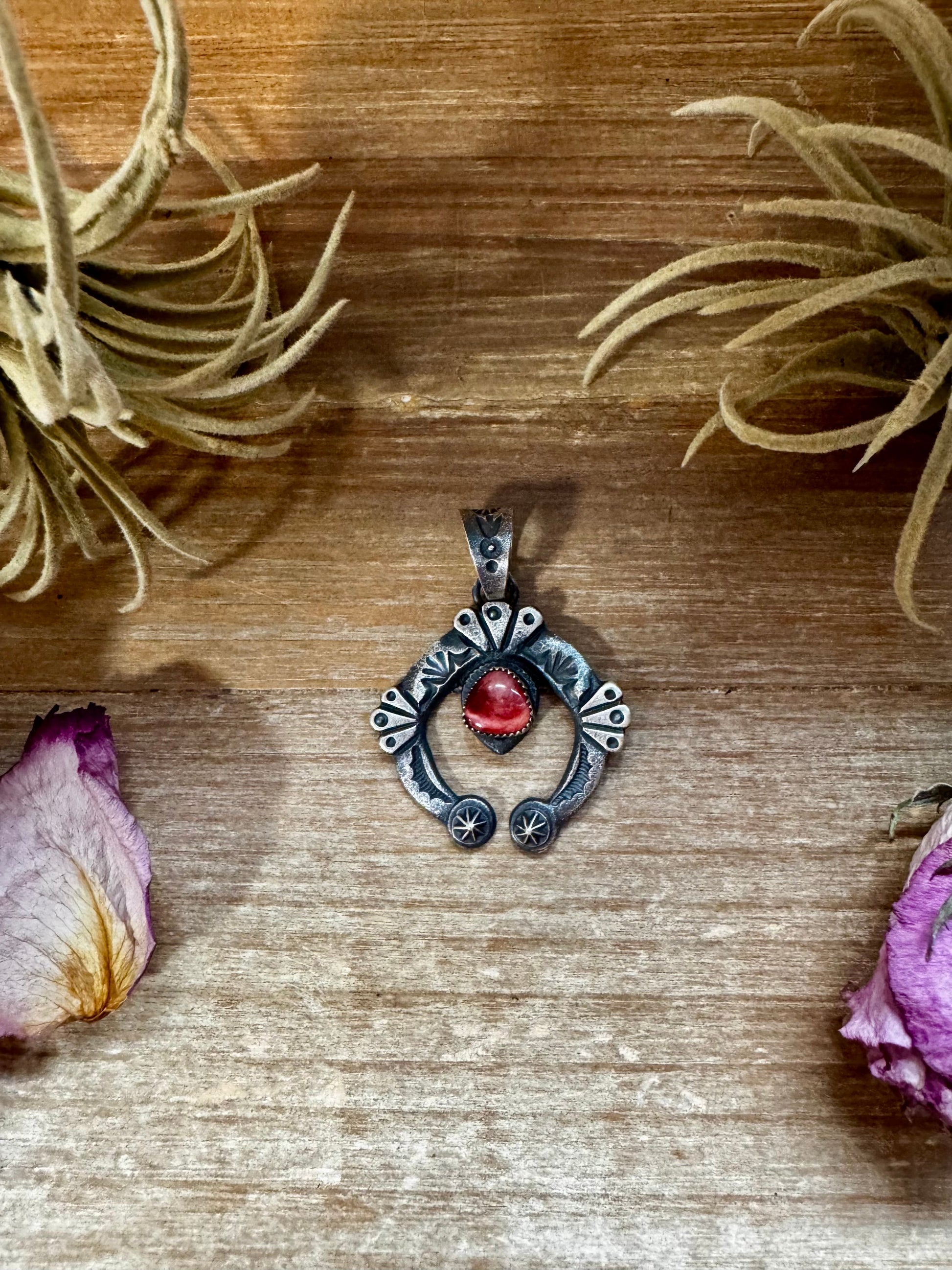 Handmade in the USA, this sterling silver Naja pendant features a striking dark red and purple spiny oyster stone set at the center. Stamped KB for authenticity, it highlights traditional Native silversmithing paired with the deep, natural tones of spiny oyster shell. The bail fits up to 8mm pearls, making it ideal for pairing with sterling silver pearl strands or layering with other turquoise and spiny jewelry. Truly one of a kind.