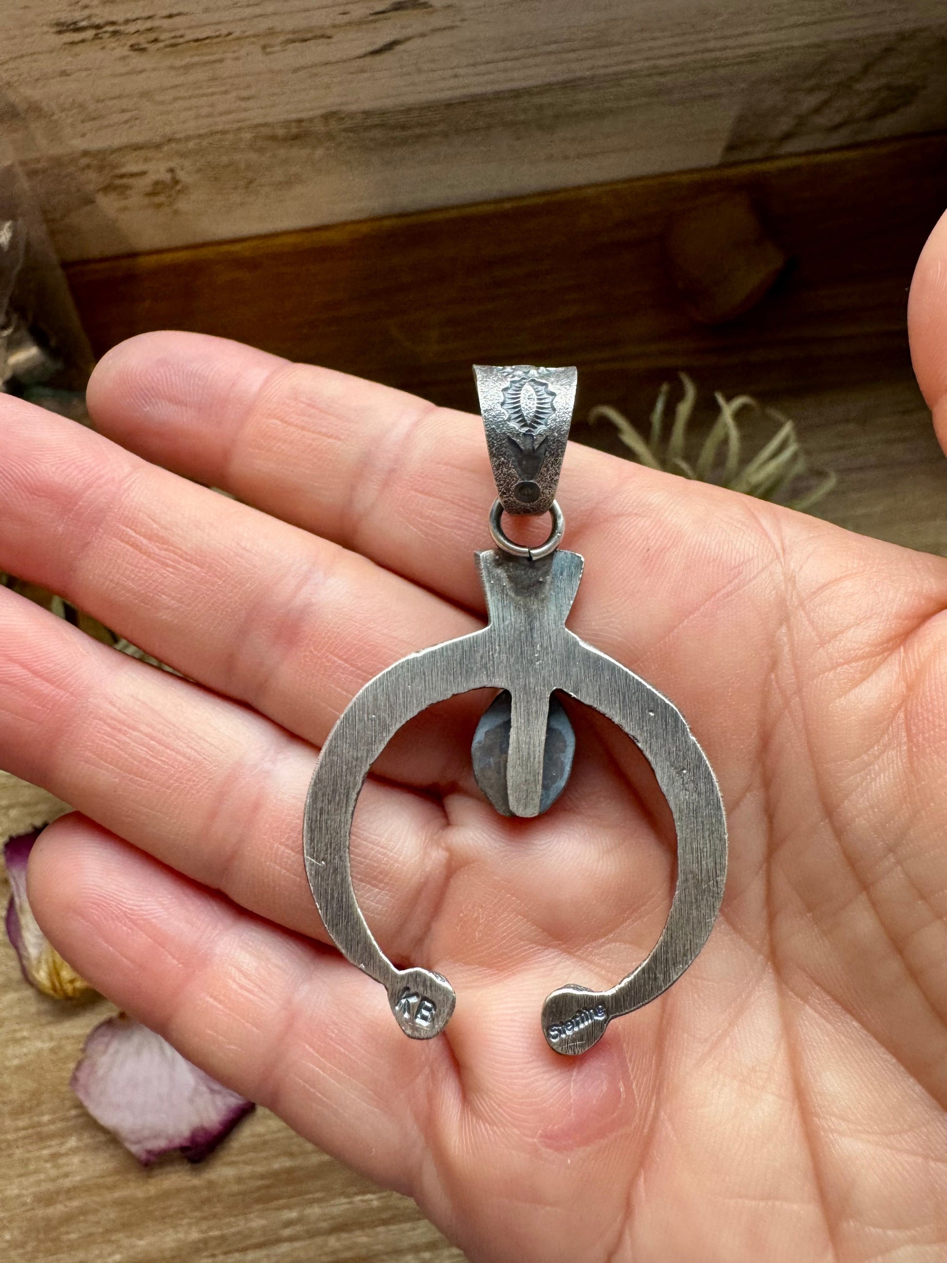 Handmade in the USA, this sterling silver Naja pendant features detailed silverwork with a genuine Golden Hill turquoise stone in a unique variation of soft blue with natural matrix. Stamped KB for authenticity, it’s a showcase of traditional Native silversmithing and artistry. The bail fits up to 8mm pearls, making it ideal for pairing with a sterling silver pearl strand or layering with other turquoise pieces.