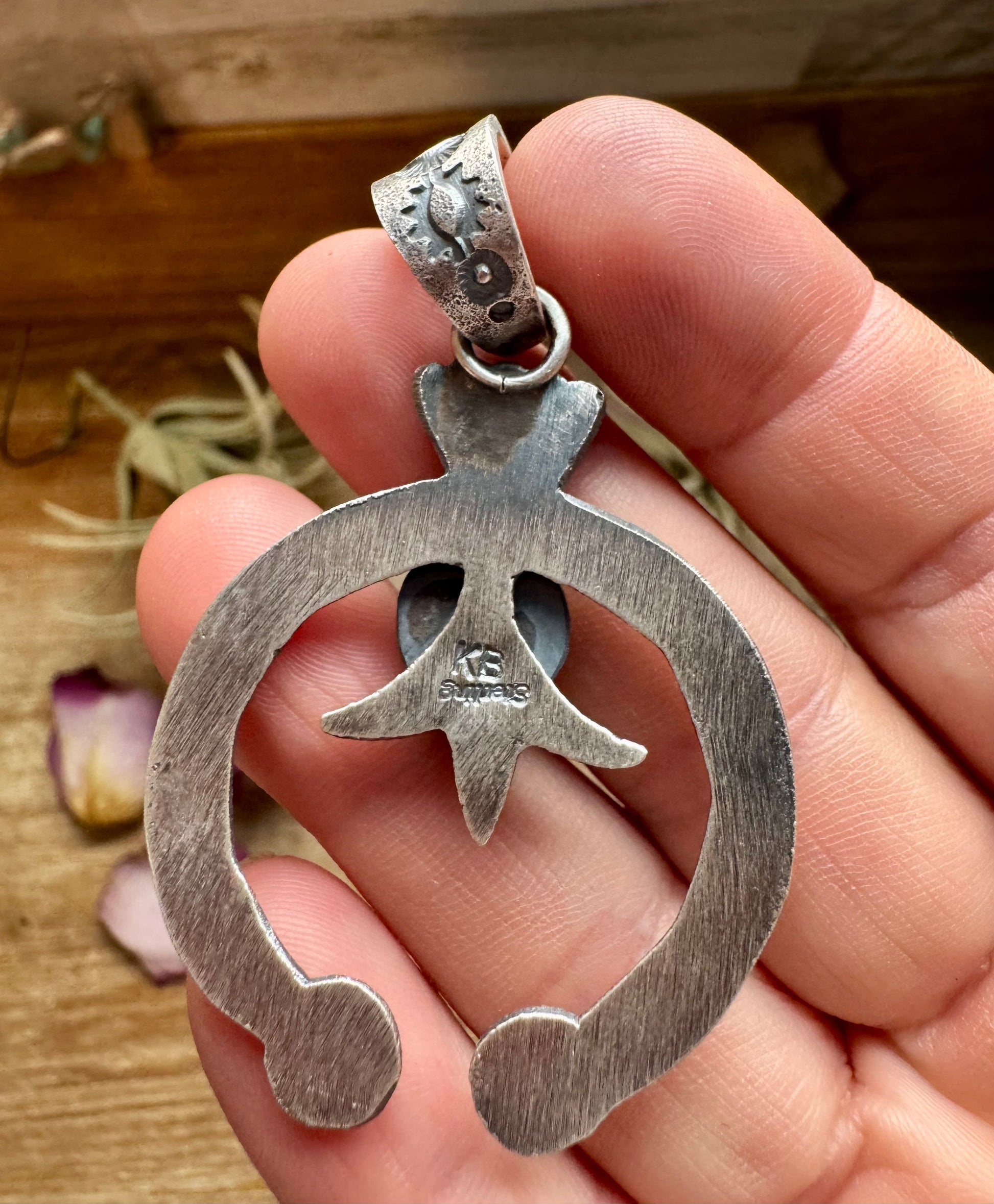 Handmade in the USA, this sterling silver Naja pendant features intricate silverwork with a genuine Golden Hill turquoise stone set at the center. Known for its soft blue tones and delicate matrix, Golden Hill turquoise is among the most collectible varieties today. Stamped KB for authenticity, this pendant highlights traditional Native silversmithing and artistry. The bail fits up to 8mm pearls, making it perfect to wear with a sterling silver pearl strand or layered with other Southwestern jewelry.