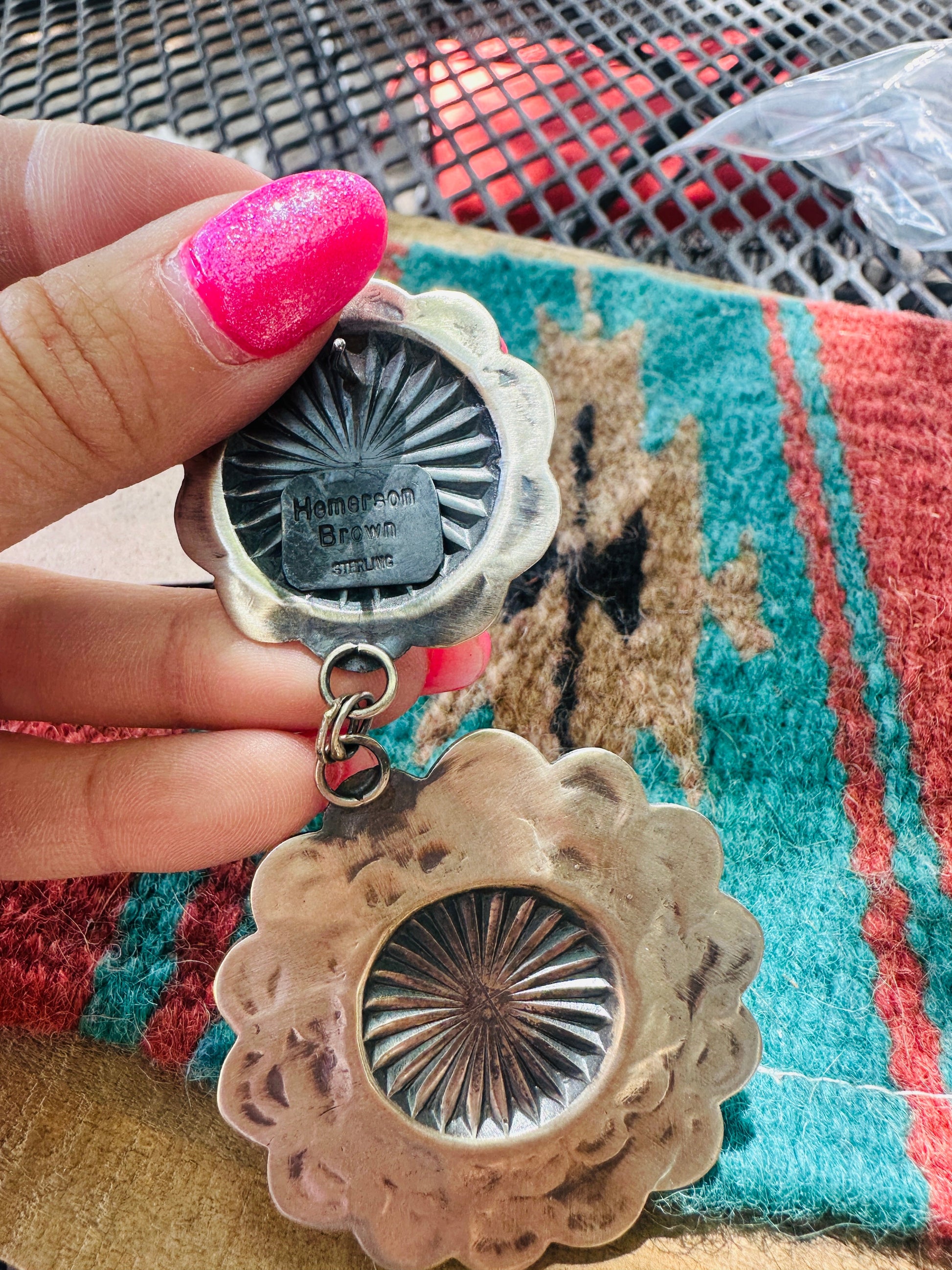 Navajo Hand Stamped Sterling Silver Concho Dangle Earrings. Such a gorgeous pair for any collection! These beauties measure 3 3/4 inches long and 2 inches wide. Stamped Sterling and signed by the artist Hemerson Brown.