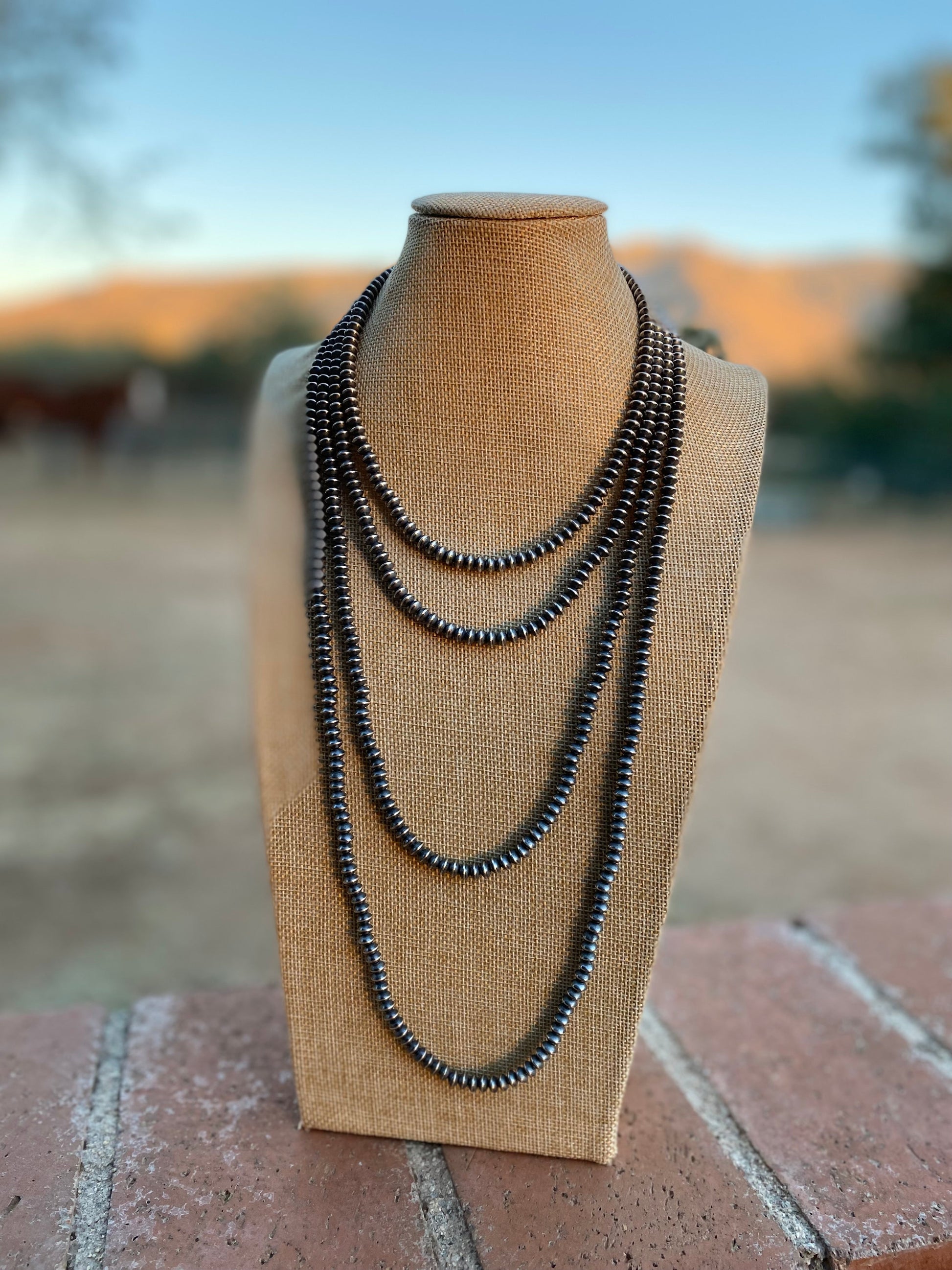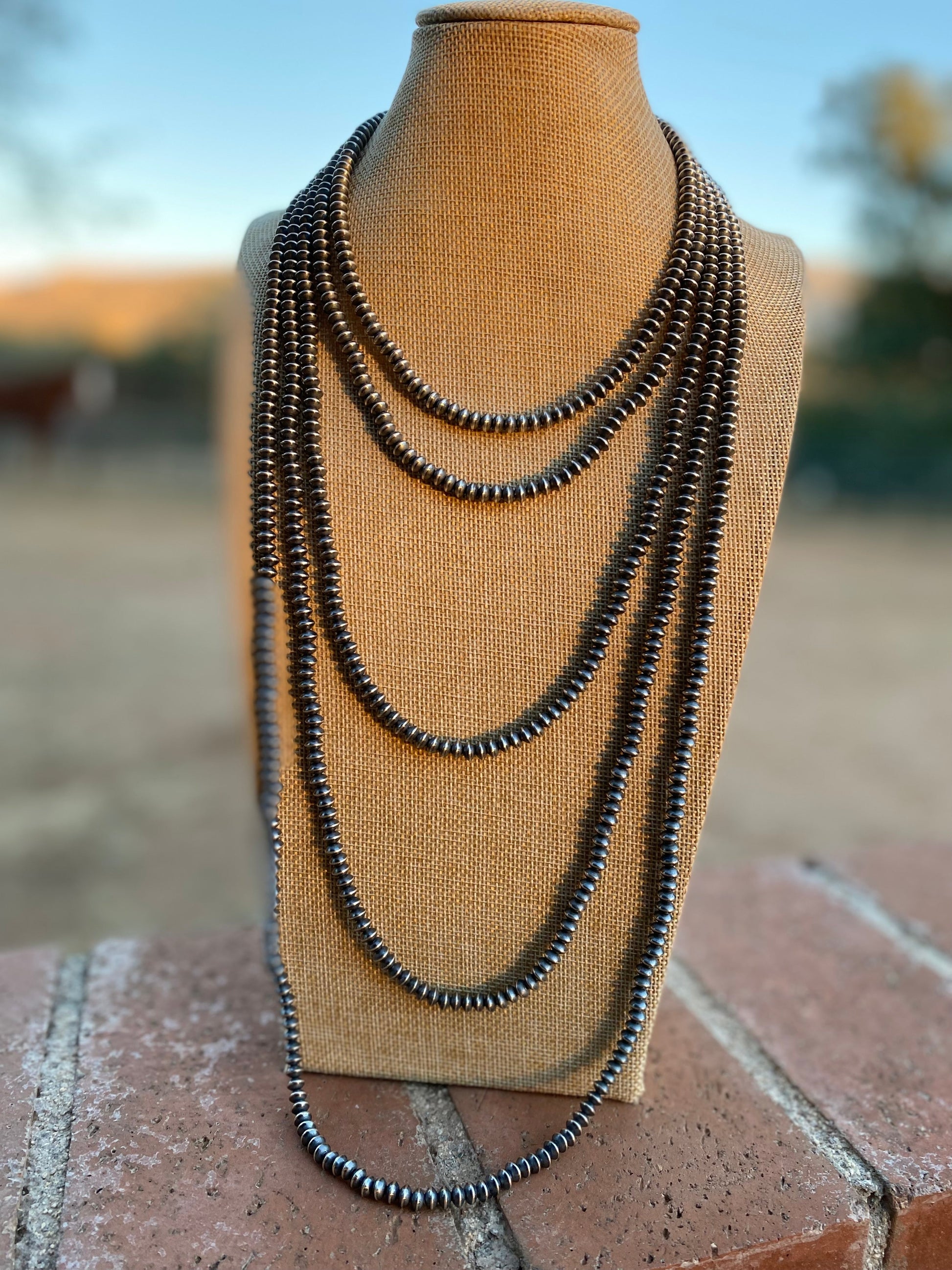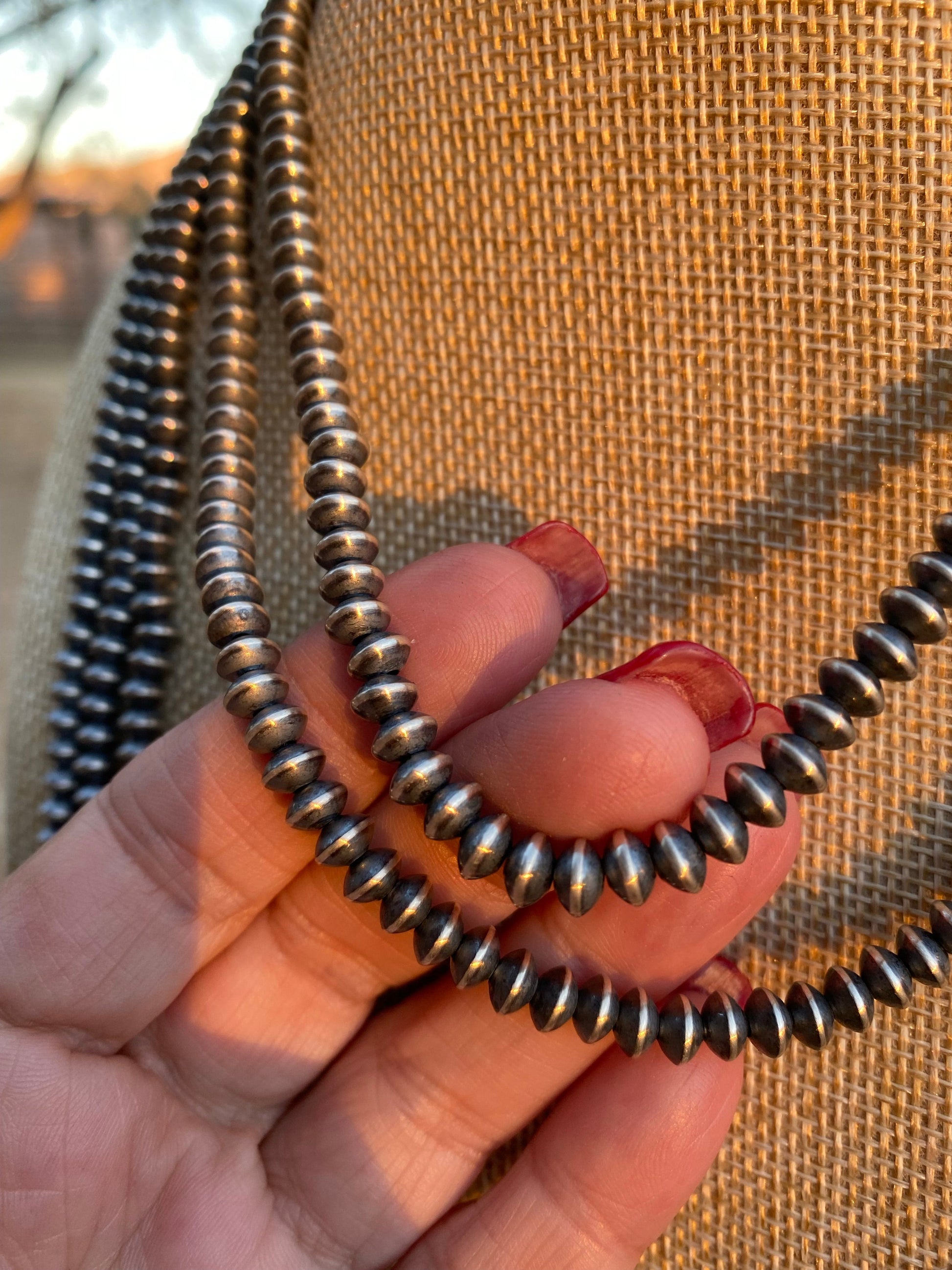 These are Sterling Silver 6mm Navajo Saucer Bead Pearls. Ranging in length! Great for pairing with your favorite beads and everyday wear! Listing is for one strand. Sizes are 16,18, 20, 22, 30, and 36 inches long.