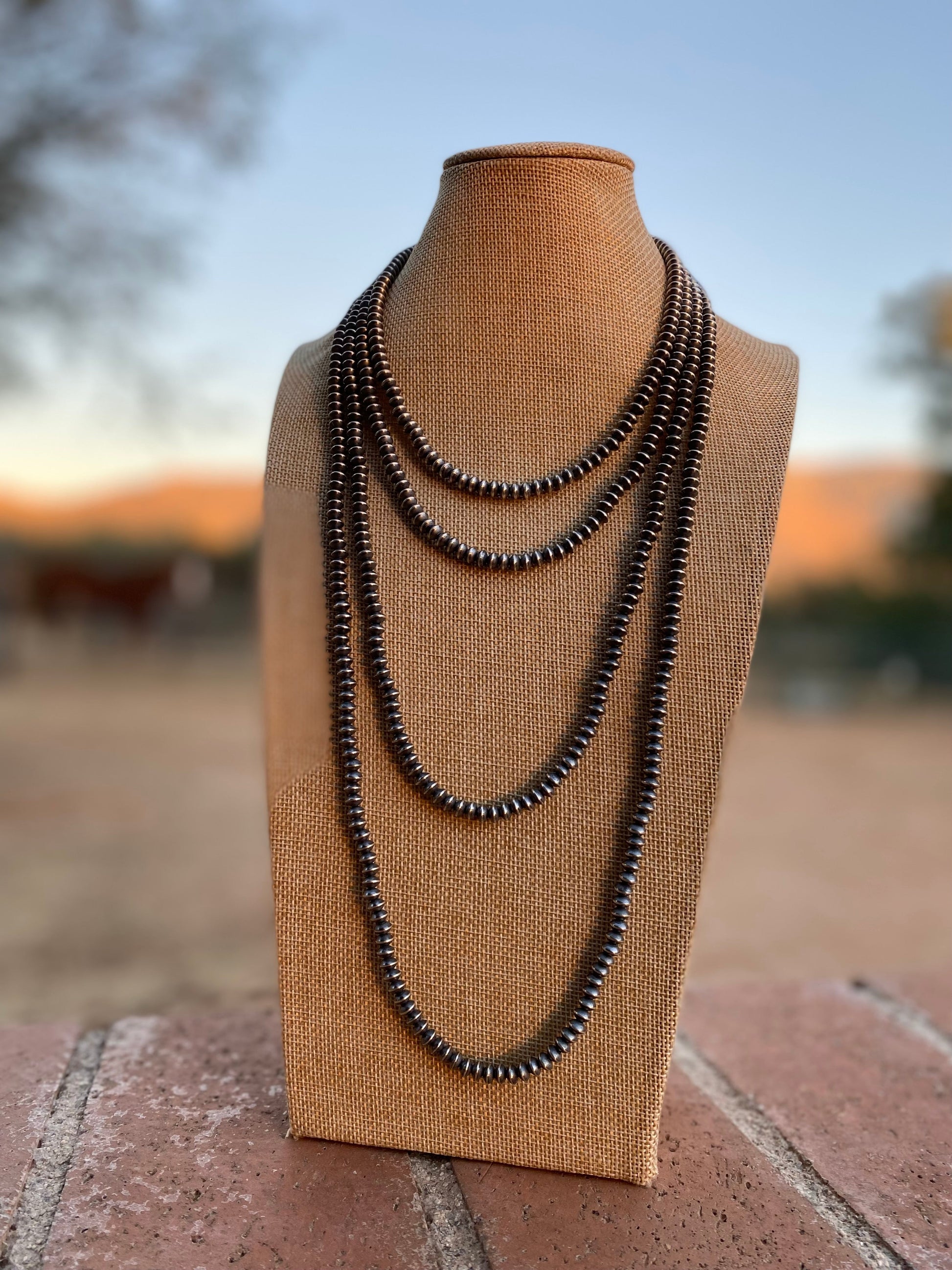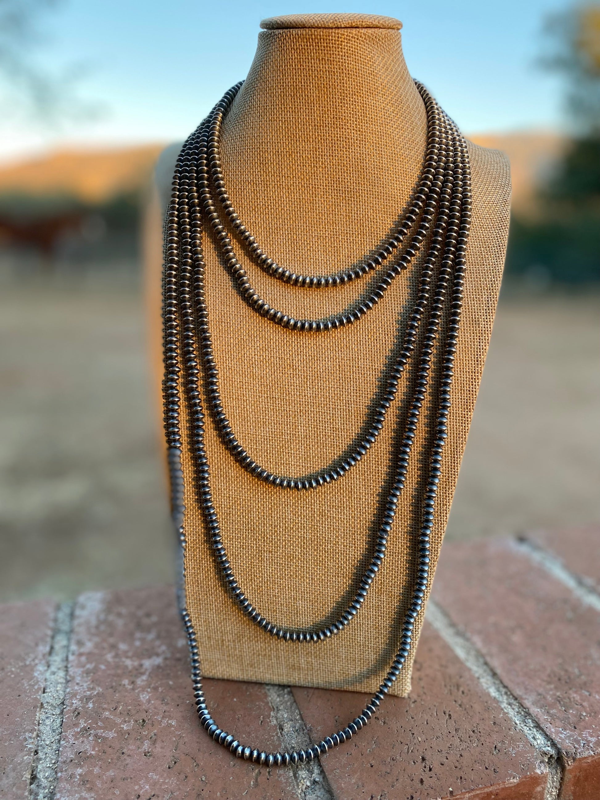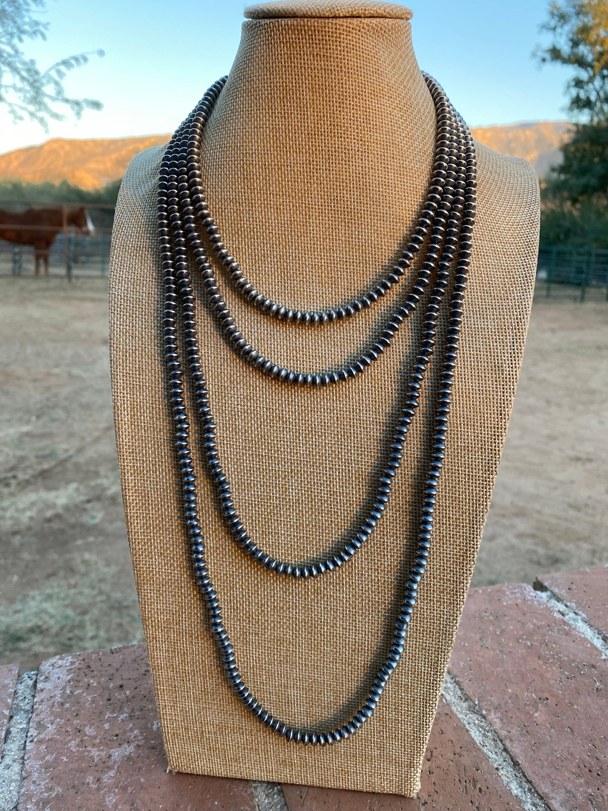 These are Sterling Silver 6mm Navajo Saucer Bead Pearls. Ranging in length! Great for pairing with your favorite beads and everyday wear! Listing is for one strand. Sizes are 16,18, 20, 22, 30, and 36 inches long.