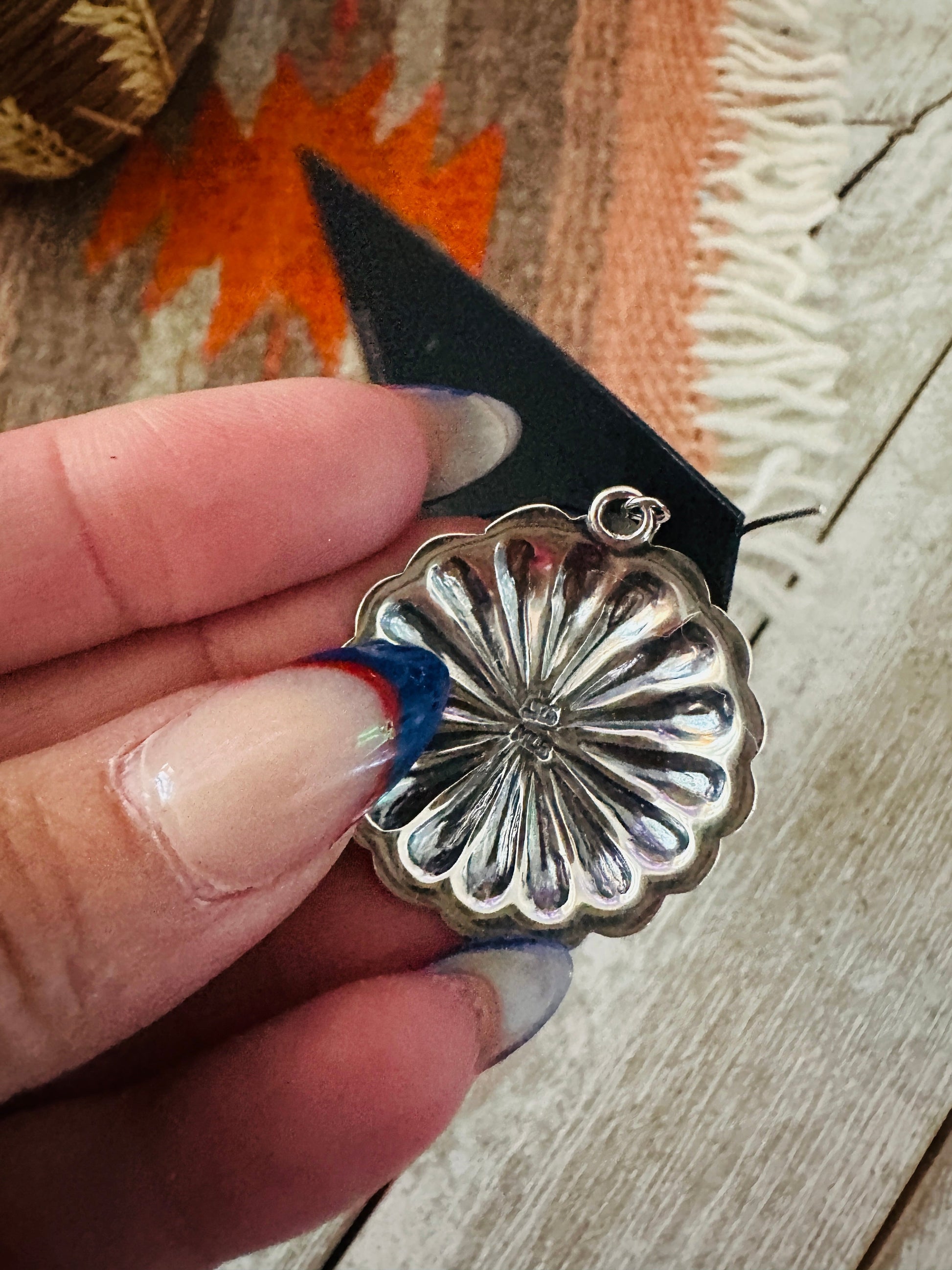 Beautiful Navajo Turquoise & Sterling Silver Concho Dangle Earrings. Measuring 1 5/8 inches long and just over 1 1/8 inches wide. Great for everyday use. Stamped Sterling and signed by the artist. Really pretty pair!