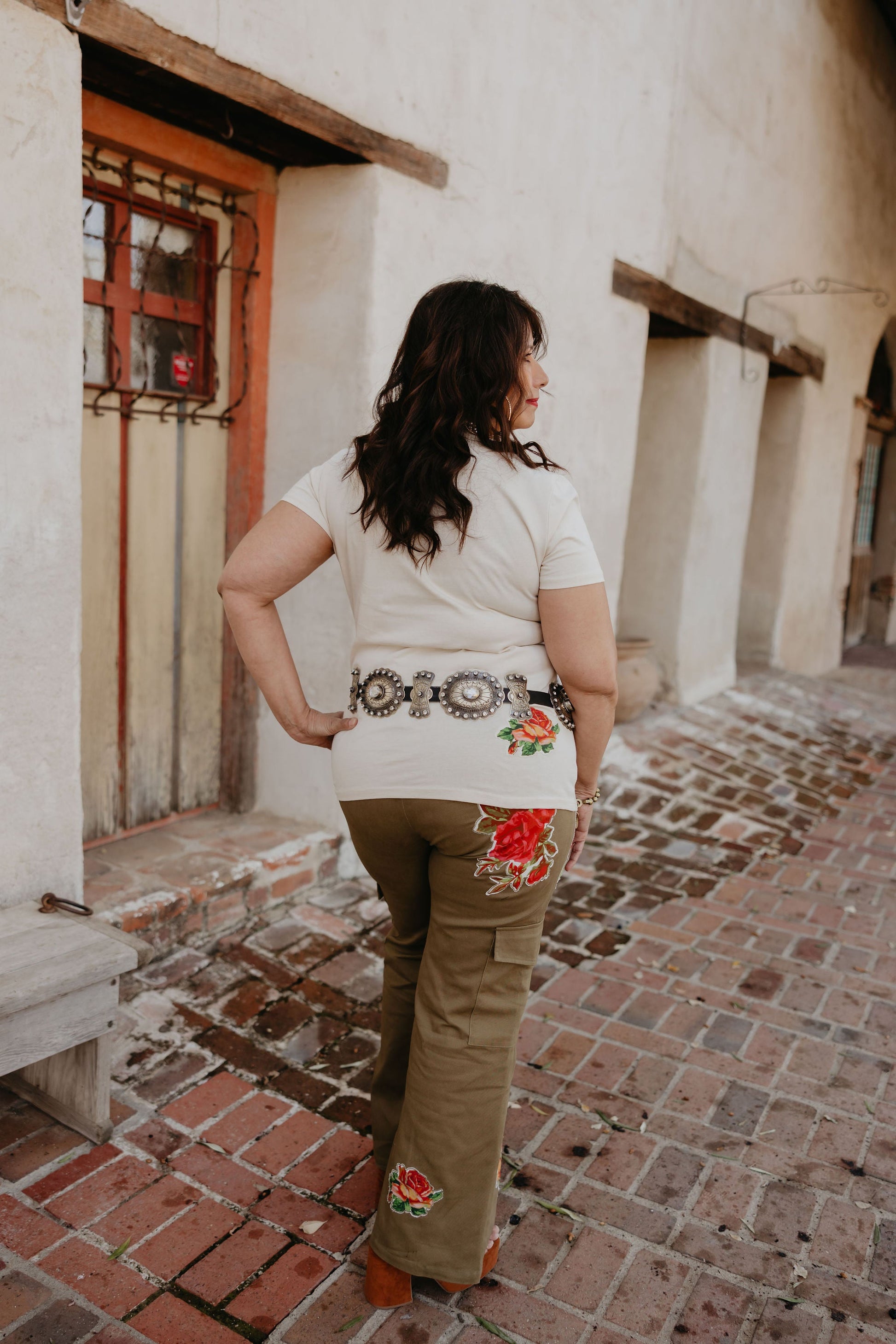 A little wild, a little romantic—the Rancho De Floras Pant brings olive-green flare with bold rose embroidery. With side pockets and a flattering fit, these pants were made to turn heads from rodeo to rooftop. Cowgirl cool, through and through.