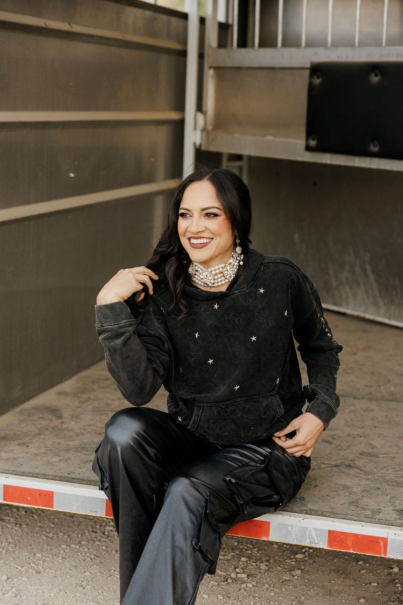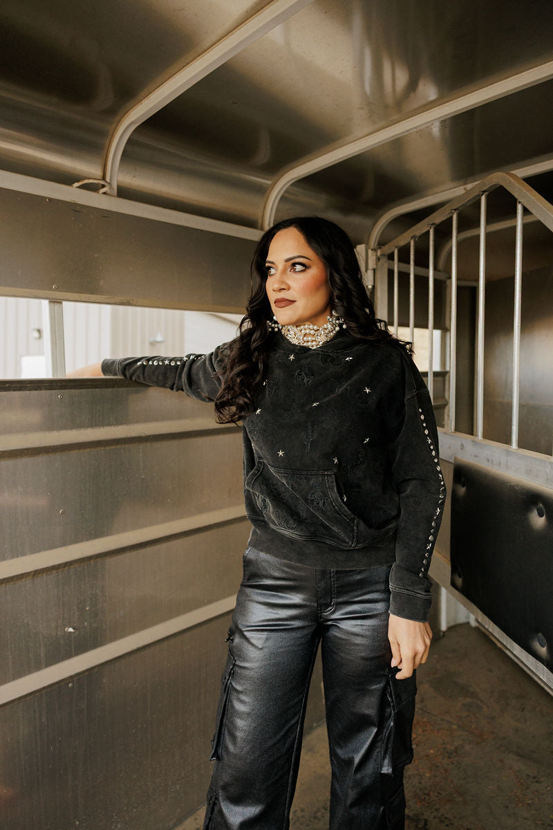 The Studded Cowboy Hoodie brings Western edge to casual wear, featuring bold stud detailing and rodeo-inspired accents. Crafted from soft, cozy fabric, it’s perfect for layering on cool nights or making a statement at the arena. This hoodie effortlessly blends rugged style with modern comfort for a true cowboy-chic look.