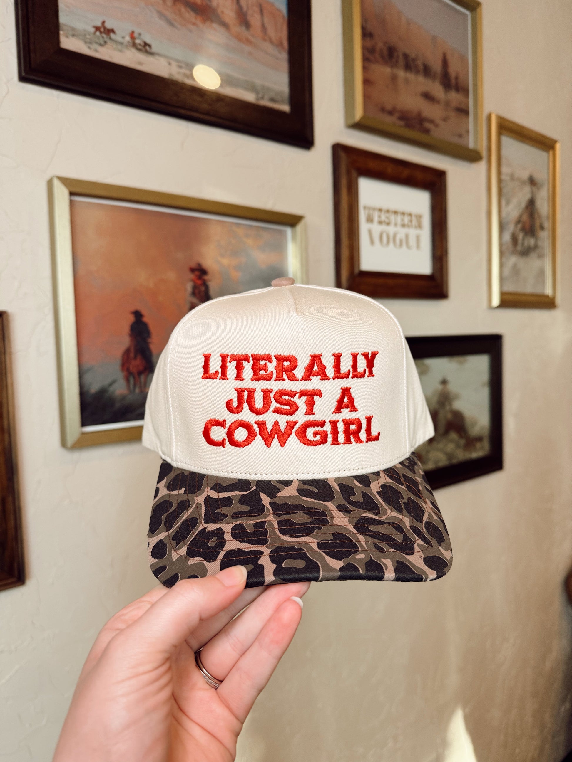 These new caps are so cute & perfect for those bad hair days too!! We are lovin' all caps right now!! Leopard print & tan mid profile baseball cap with red embroidered "Literally Just a Cowgirl" graphic.
