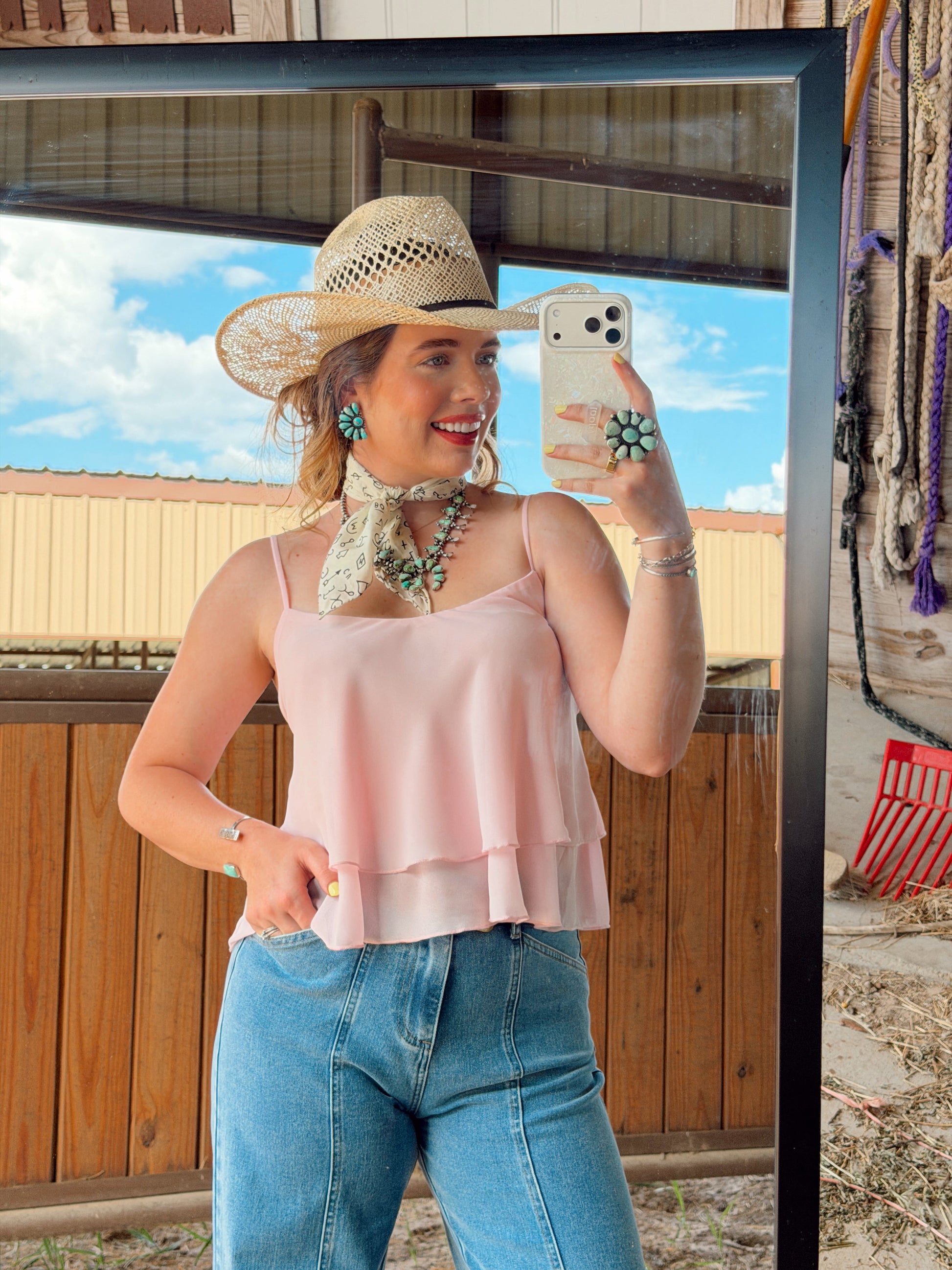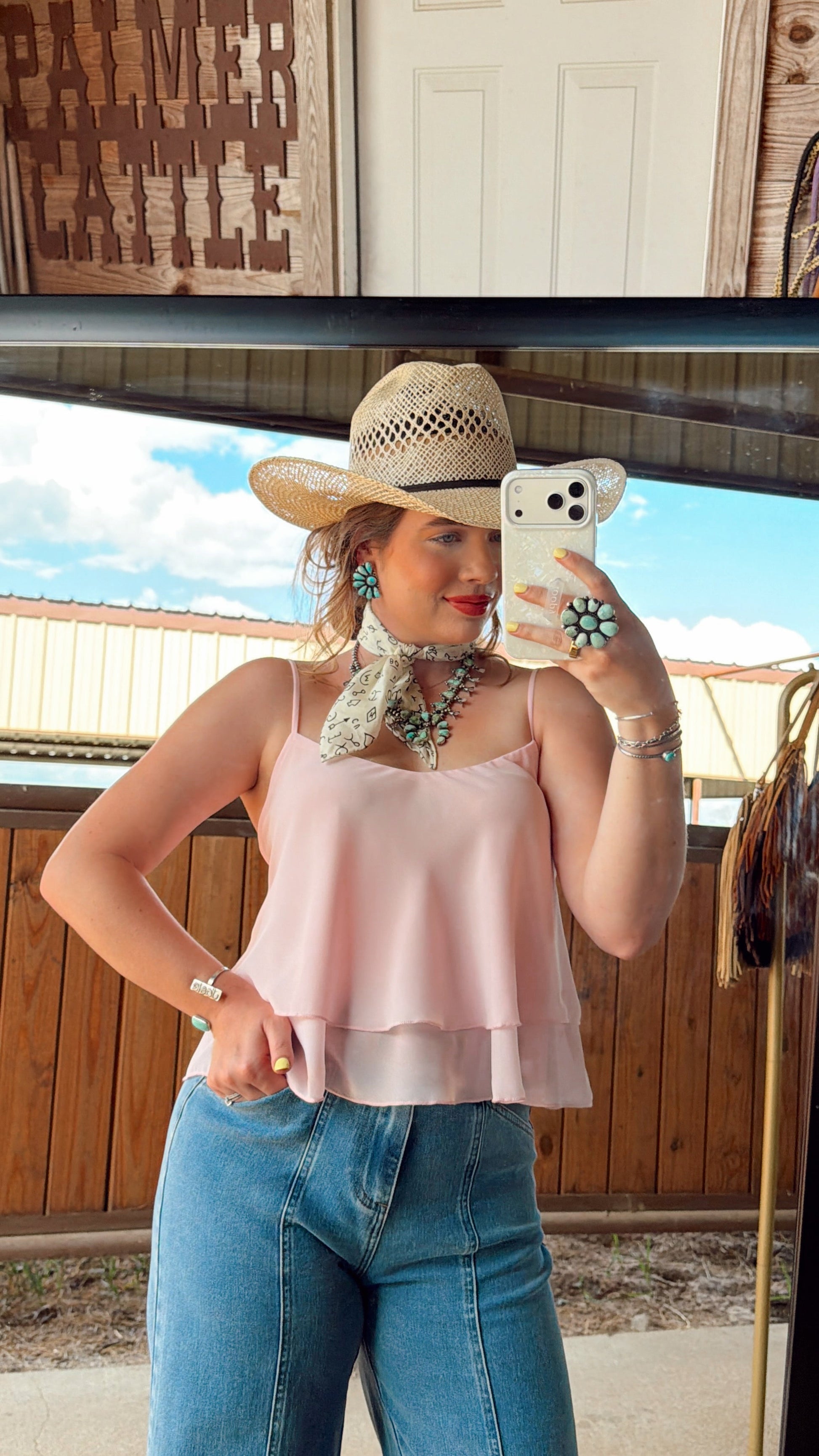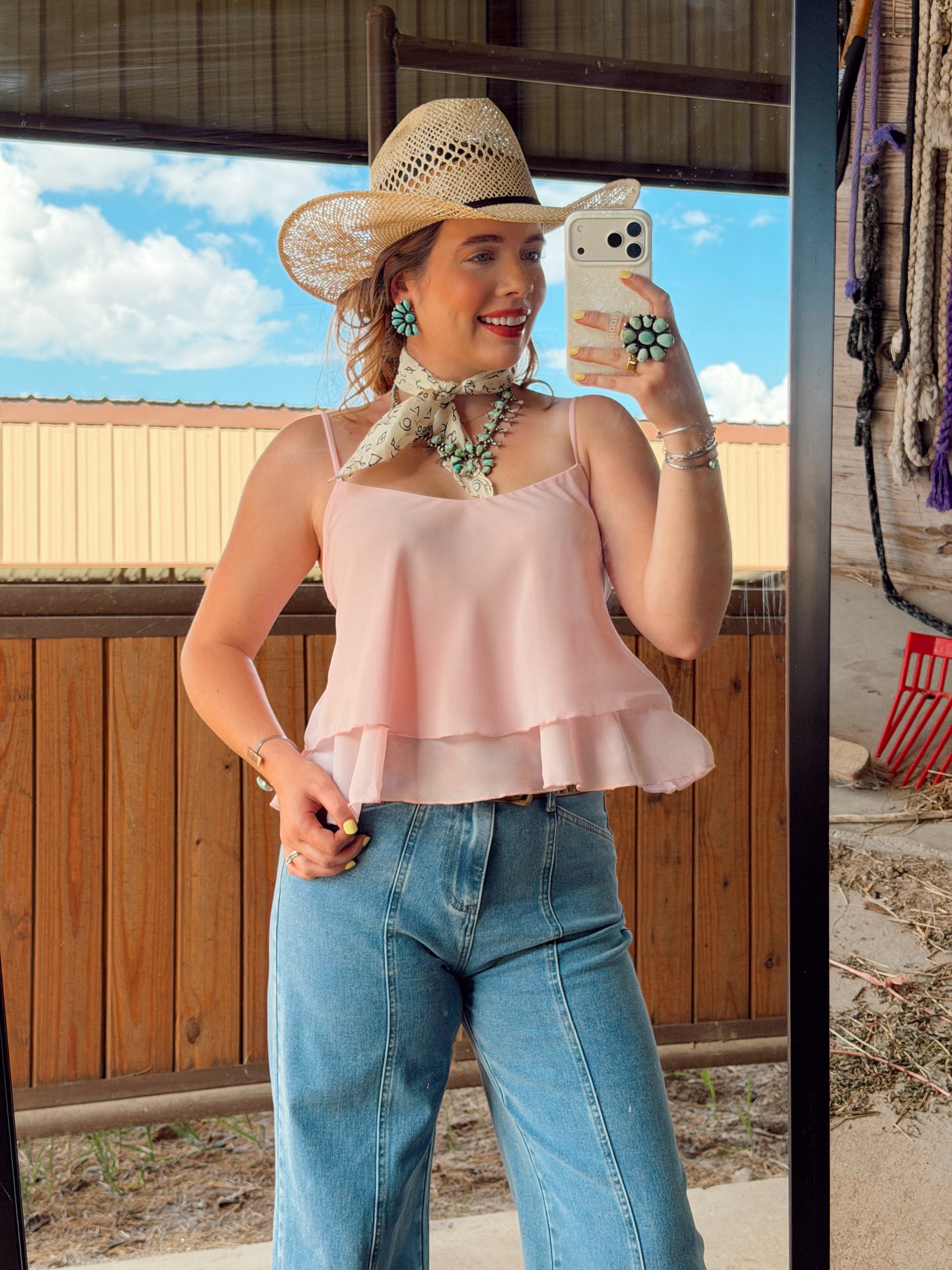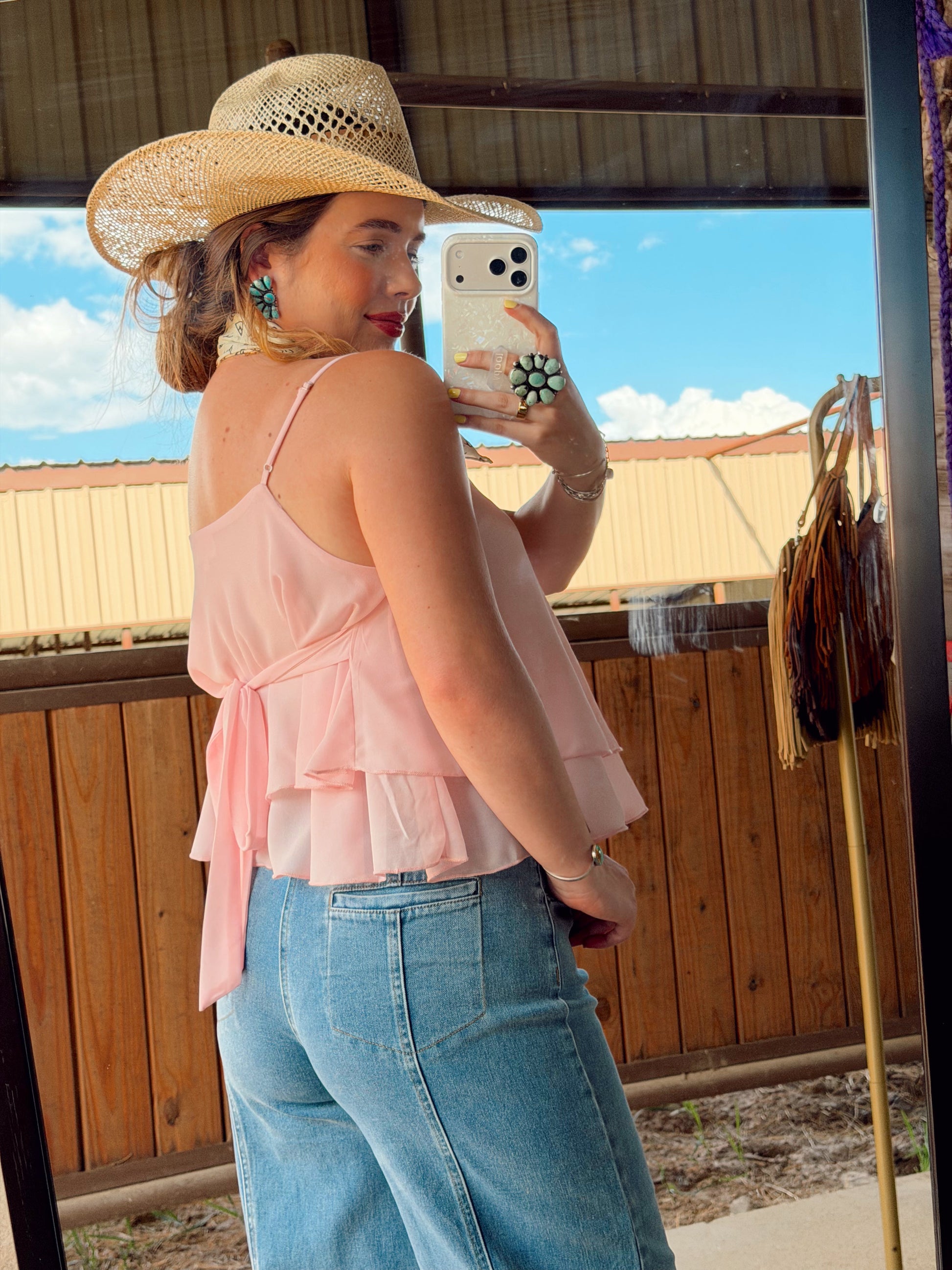 We love a cute ruffle top, so feminine & soft, it’s the perfect way to dress up your fave denim. Features adjustable straps & tie in back.