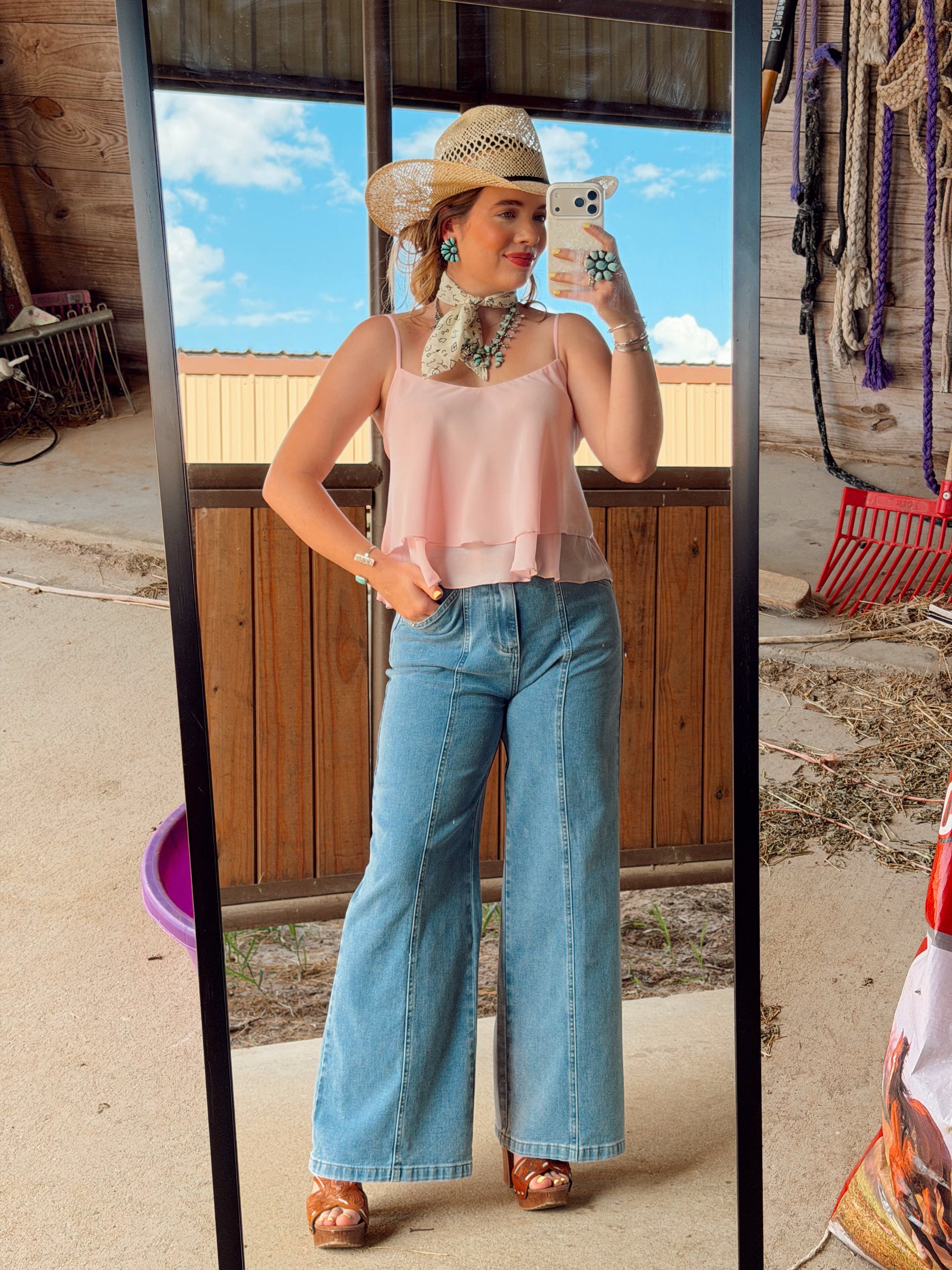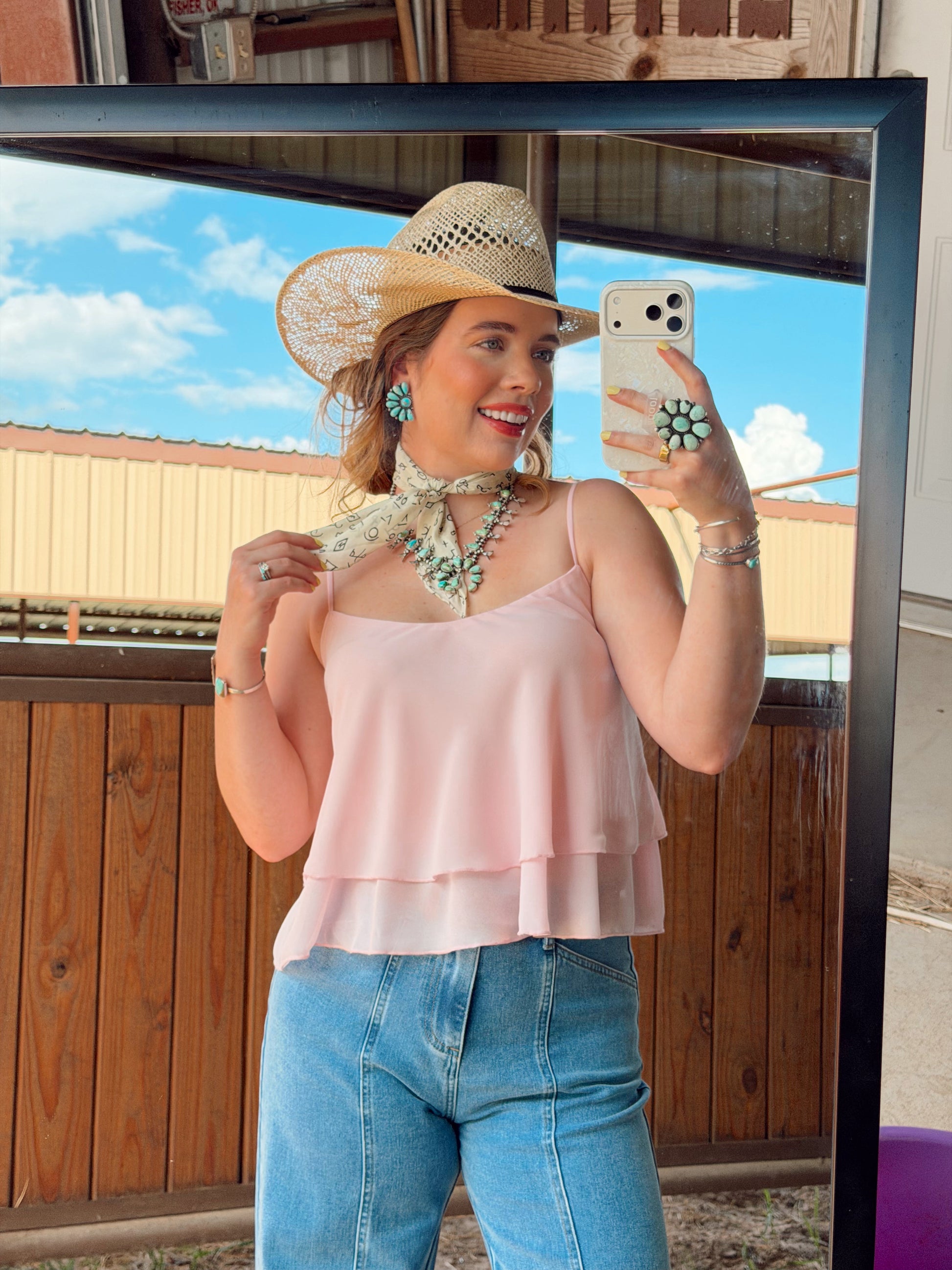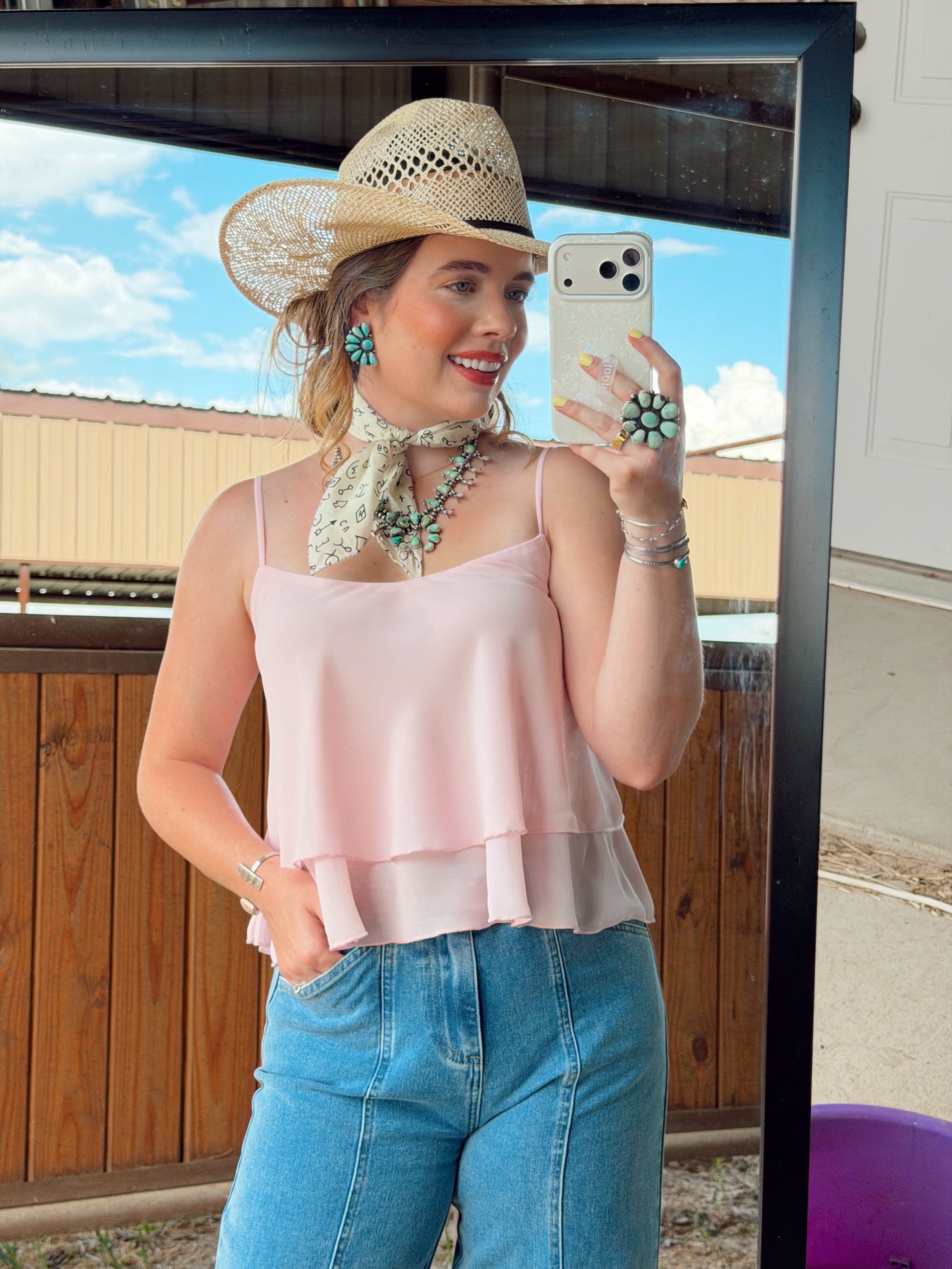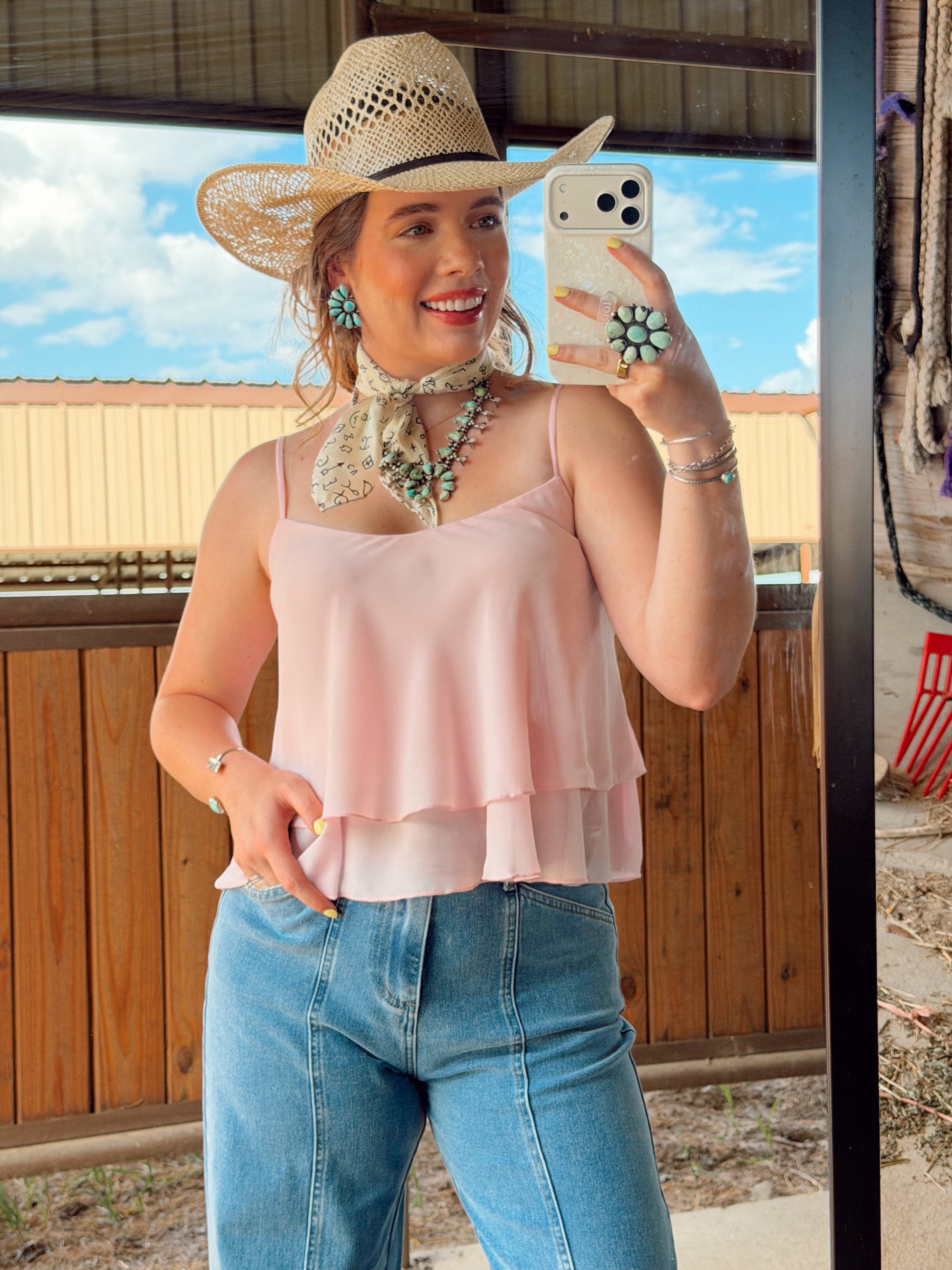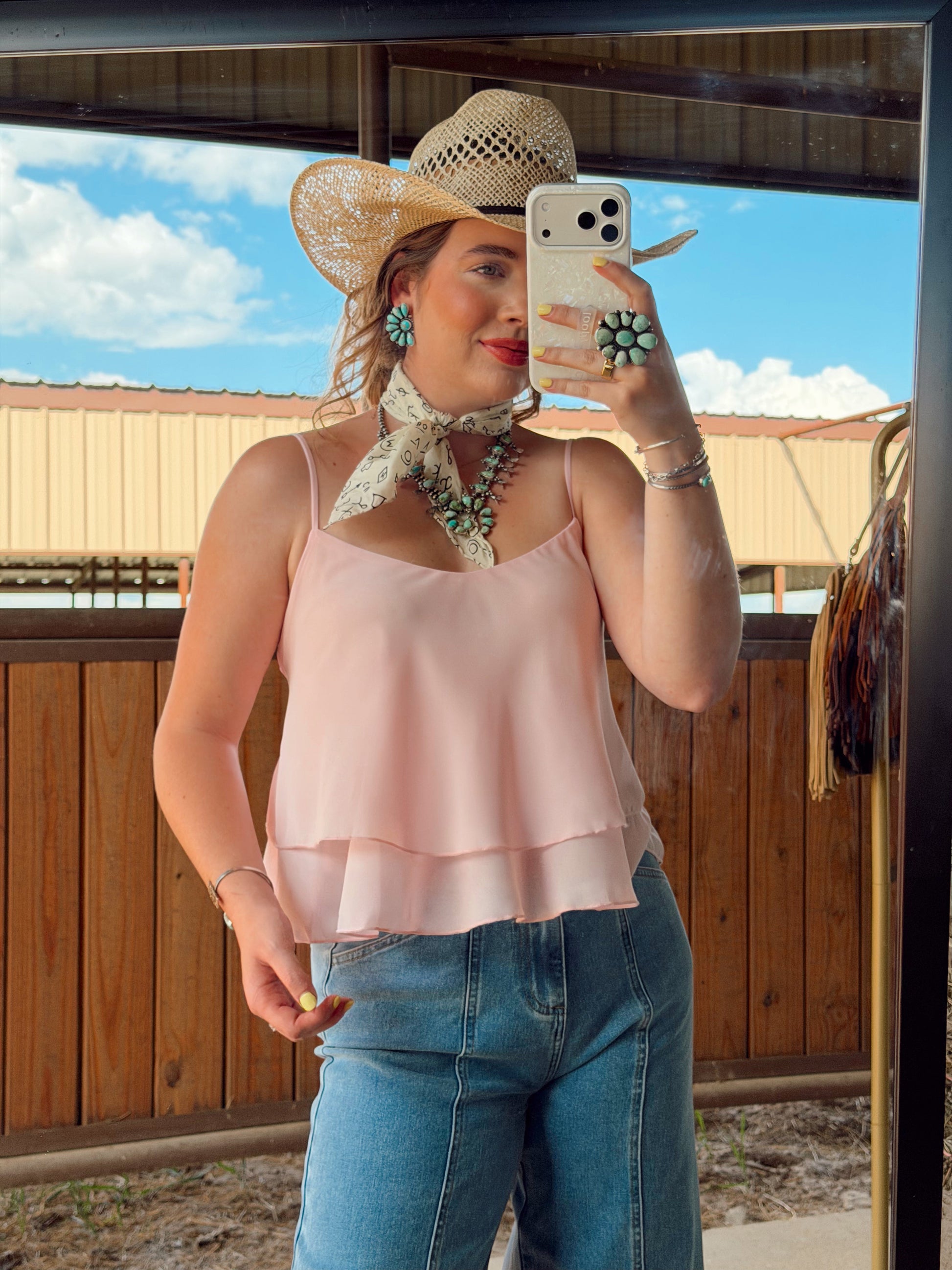 We love a cute ruffle top, so feminine & soft, it’s the perfect way to dress up your fave denim. Features adjustable straps & tie in back.