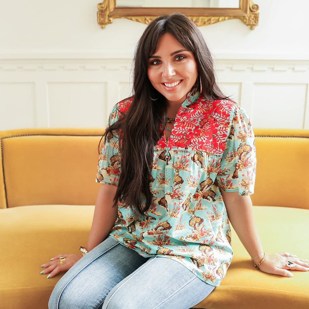 Funky and Western? Sign me up! The Reece body style is featured with bright red embroidery across the chest and a fun bucking horse graphics on a blue background.