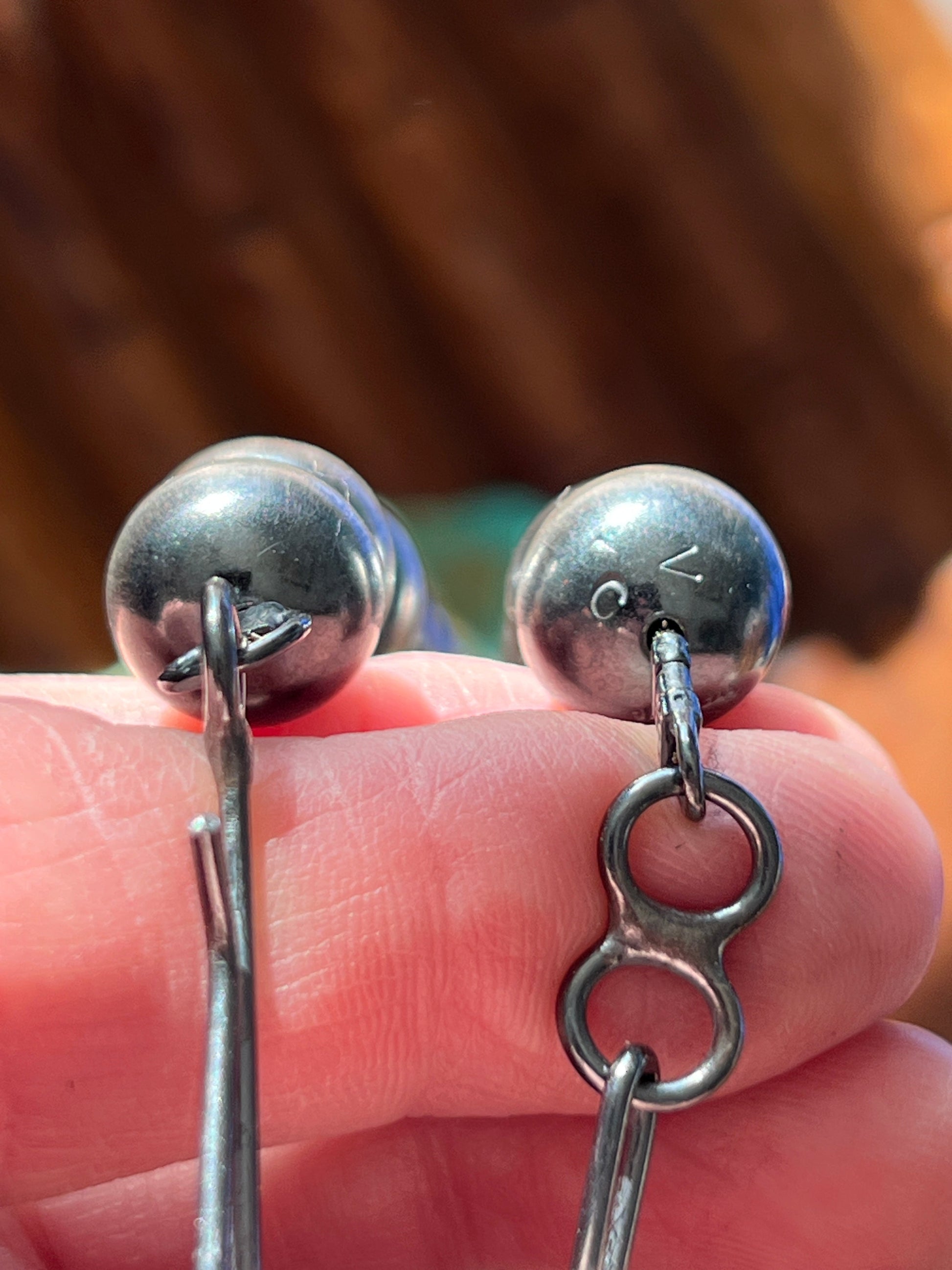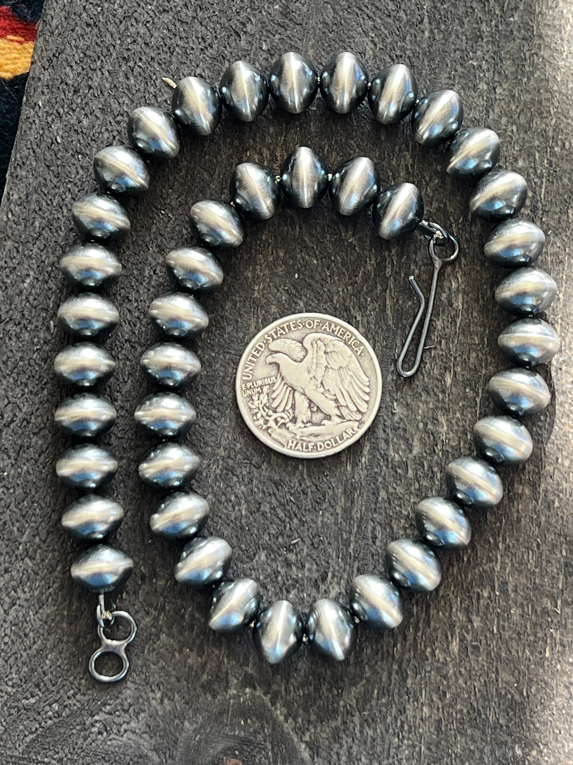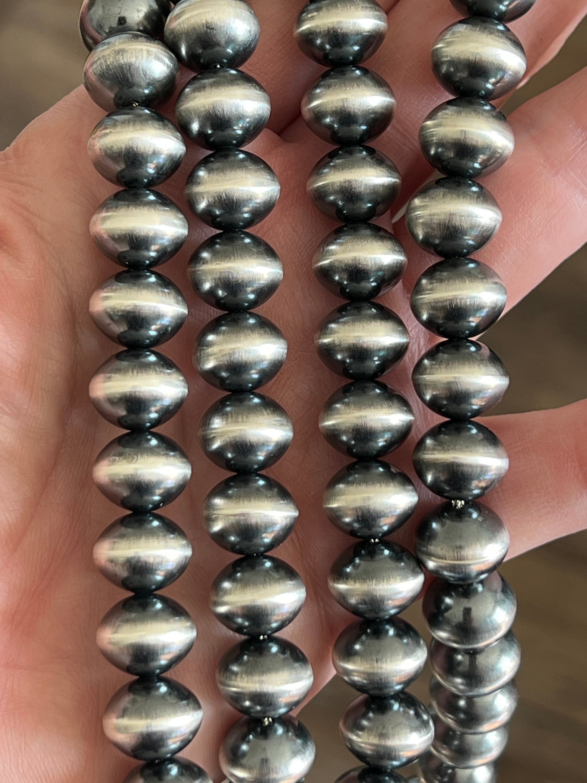 These beautiful strands of 12mm sterling silver saucer beads were handmade by Navajo artist, Vinita Cowboy. 12mm beads are chunky enough to make a statement on their own but they get even better when layered in with other beads or an added pendant to kick it up a notch! Vinita stamps a single bead with ‘sterling’ and her initials on each strand. This listing is for one beaded necklace only - be sure to search ‘Vinita Cowboy’ to see all of her beautiful handmade creations on our site.